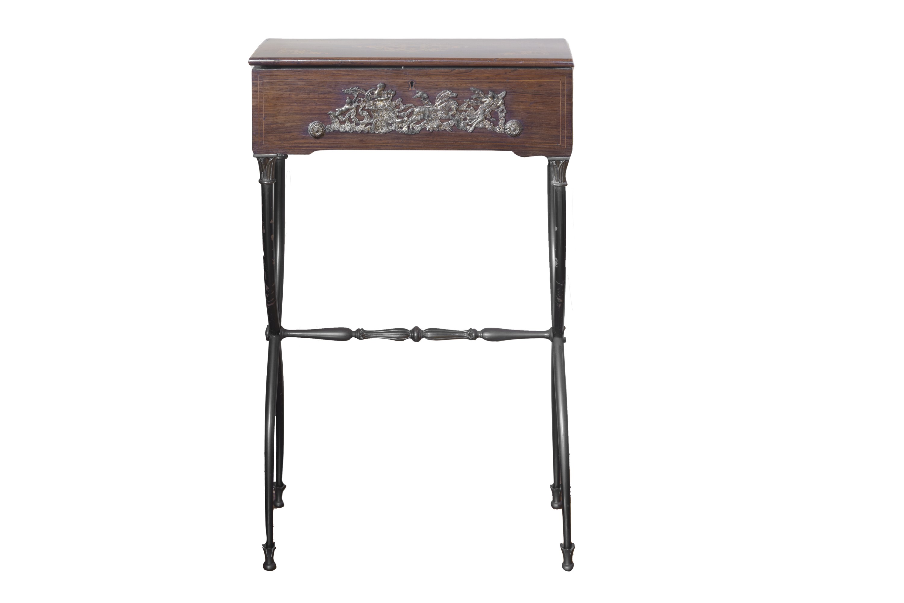cm 88,5 x 54,5 x 23,7 mobile in legno e metallo, intarsiato con motivi a rocaille sul piano e sul fronte fregio in bronzo dorato raffigurante carro trainato da cavalli, preceduto da fama alata e sormontato da figura femminile con lira; firmato sul carillon in alto a sinistra Ducommun Girod e con numero di serie 16309