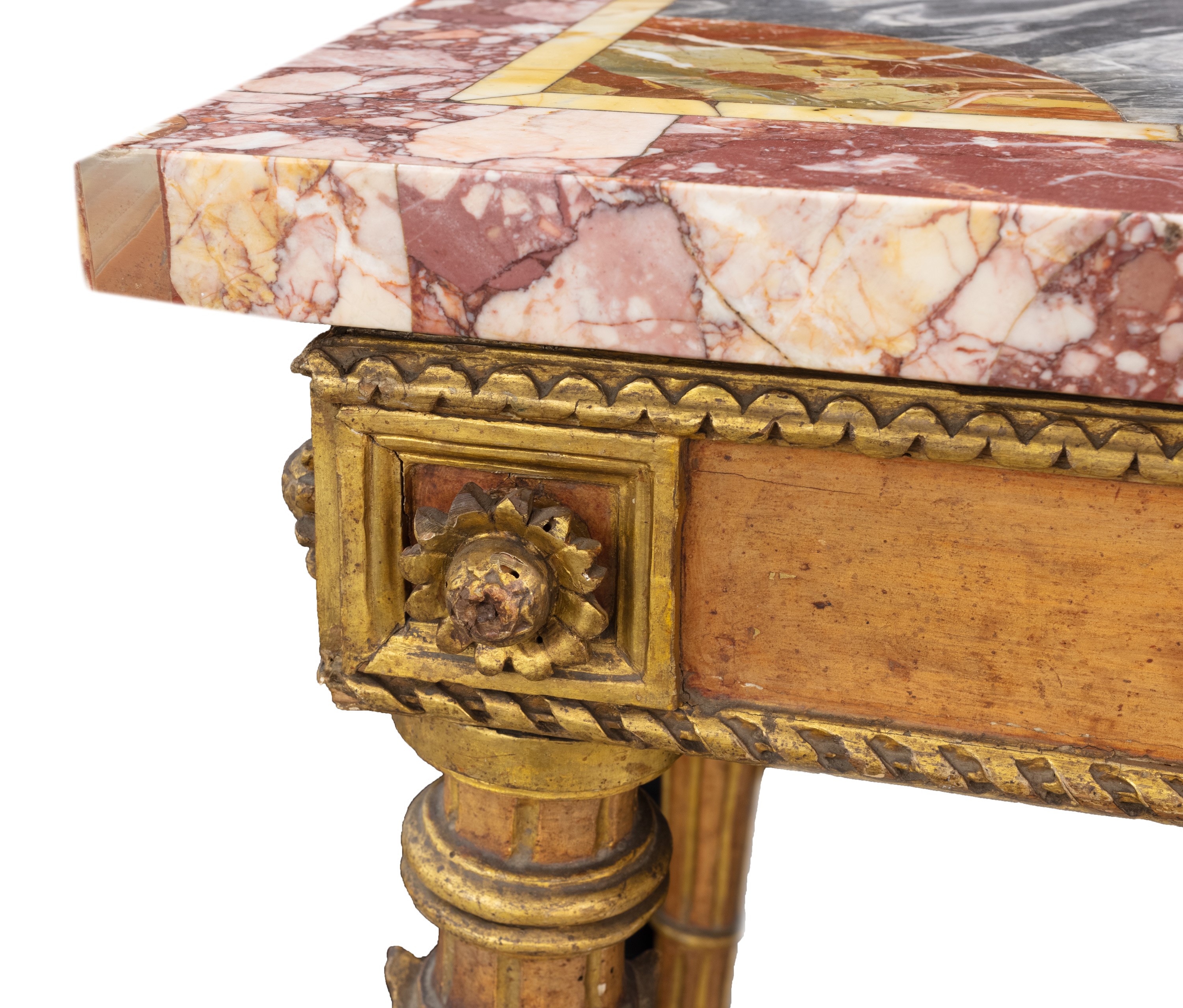 Console laccata e dorata Luigi XVI, con piano in marmo, fine del secolo XVIII