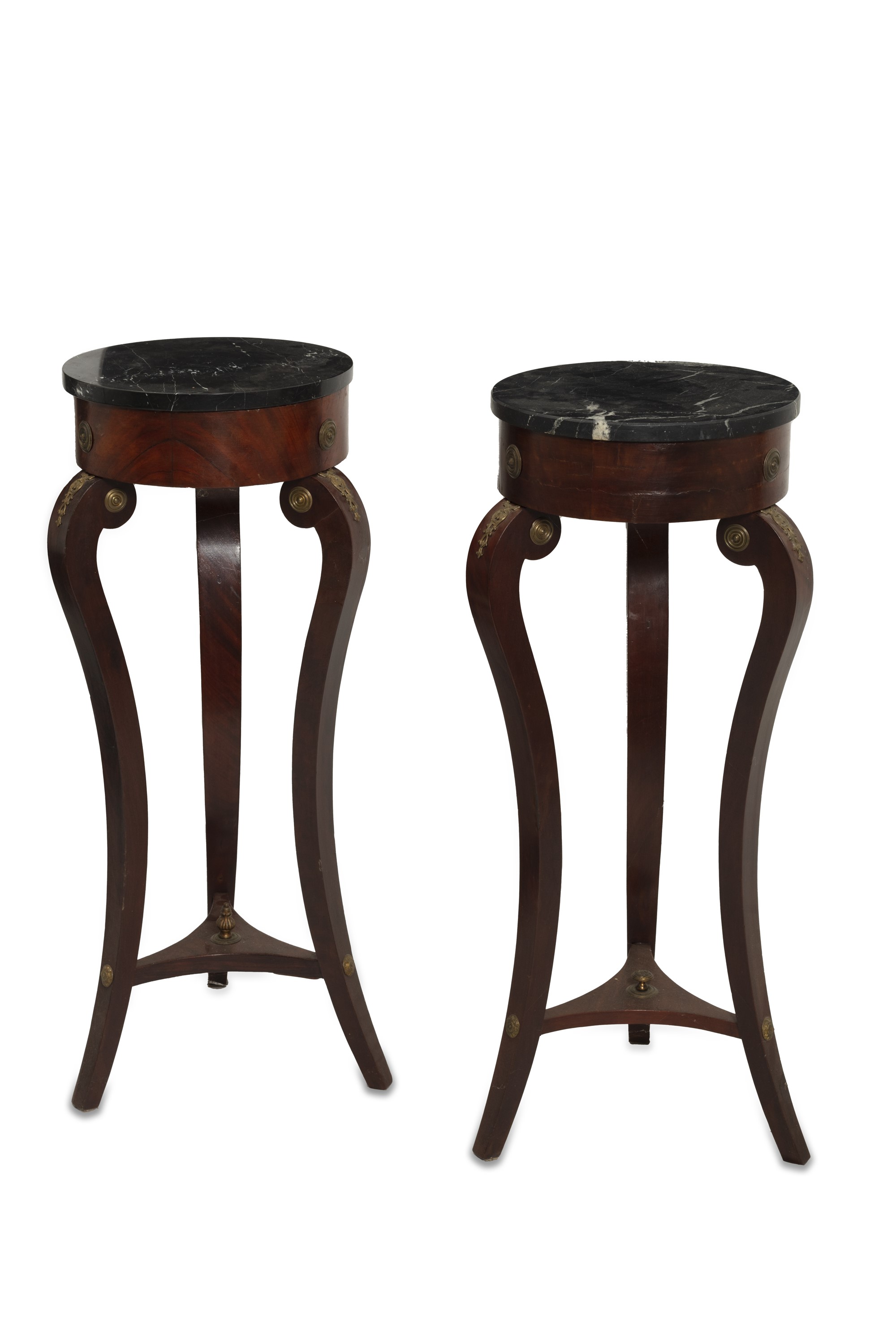 Coppia di gueridon in legno, con applicazioni in bronzo e piano in marmo nero, secolo [..]
