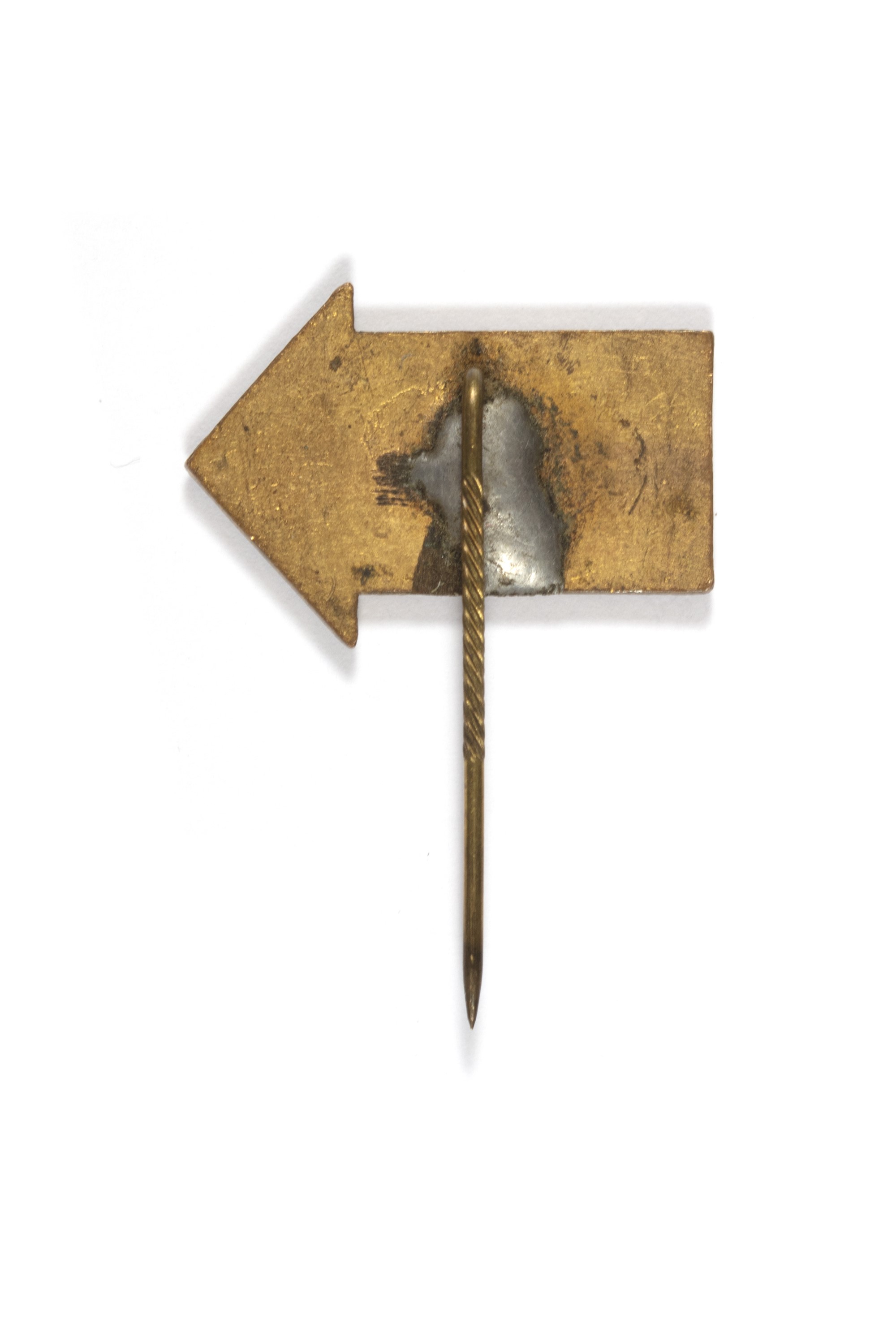 a forma di freccia con fondo in smalto rosso e scritta in oro, modificata sul retro in spilla da cravatta