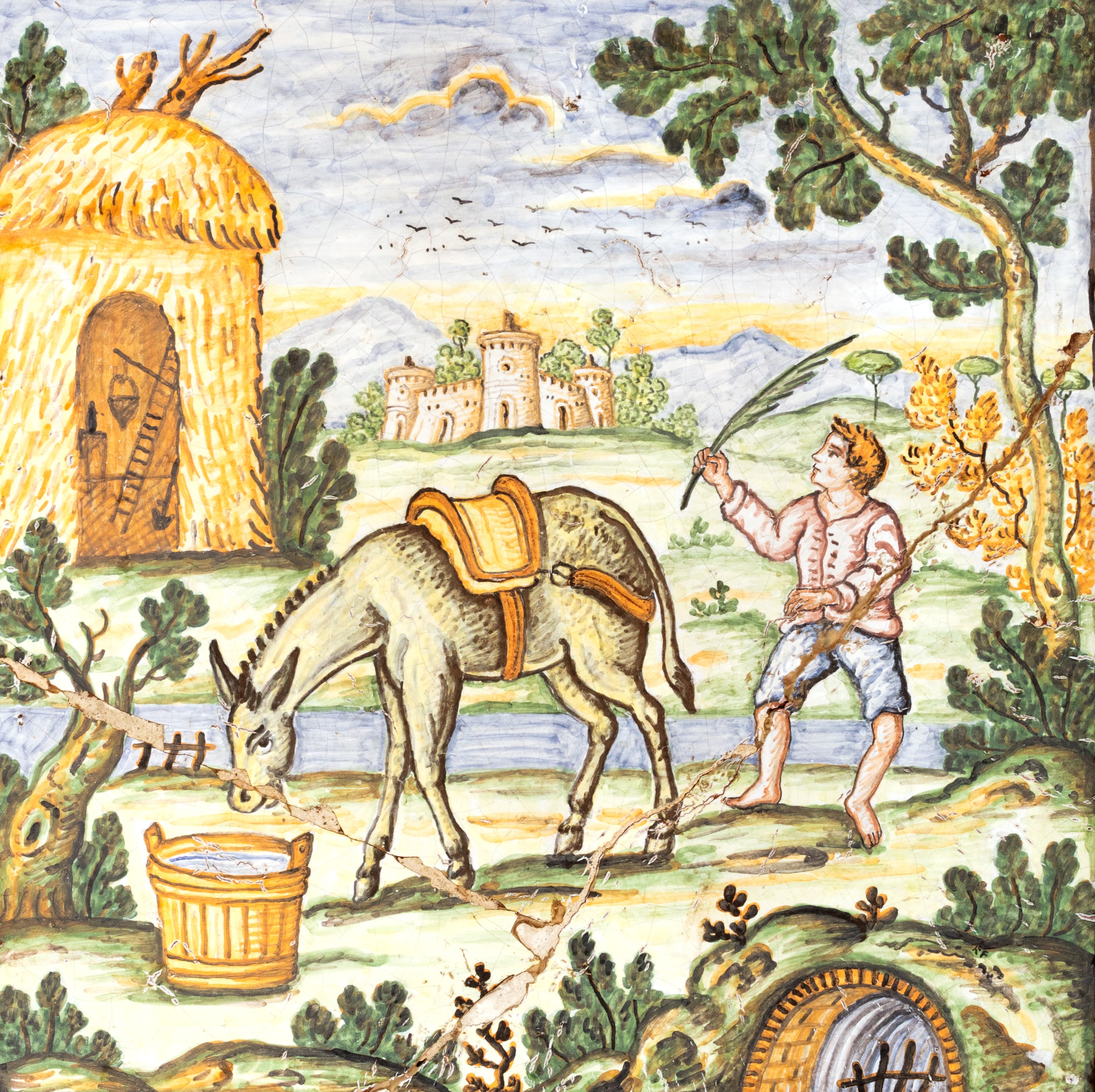 Due formelle in maiolica policroma raffiguranti scene contadine
