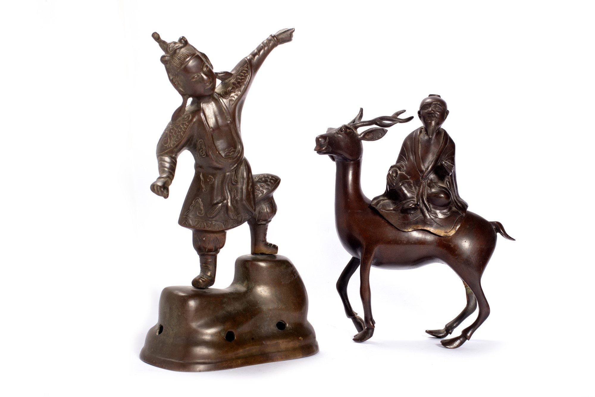 Due sculture in bronzo raffiguranti Guerriero e Saggio a cavallo di un cervo, Cina [..]