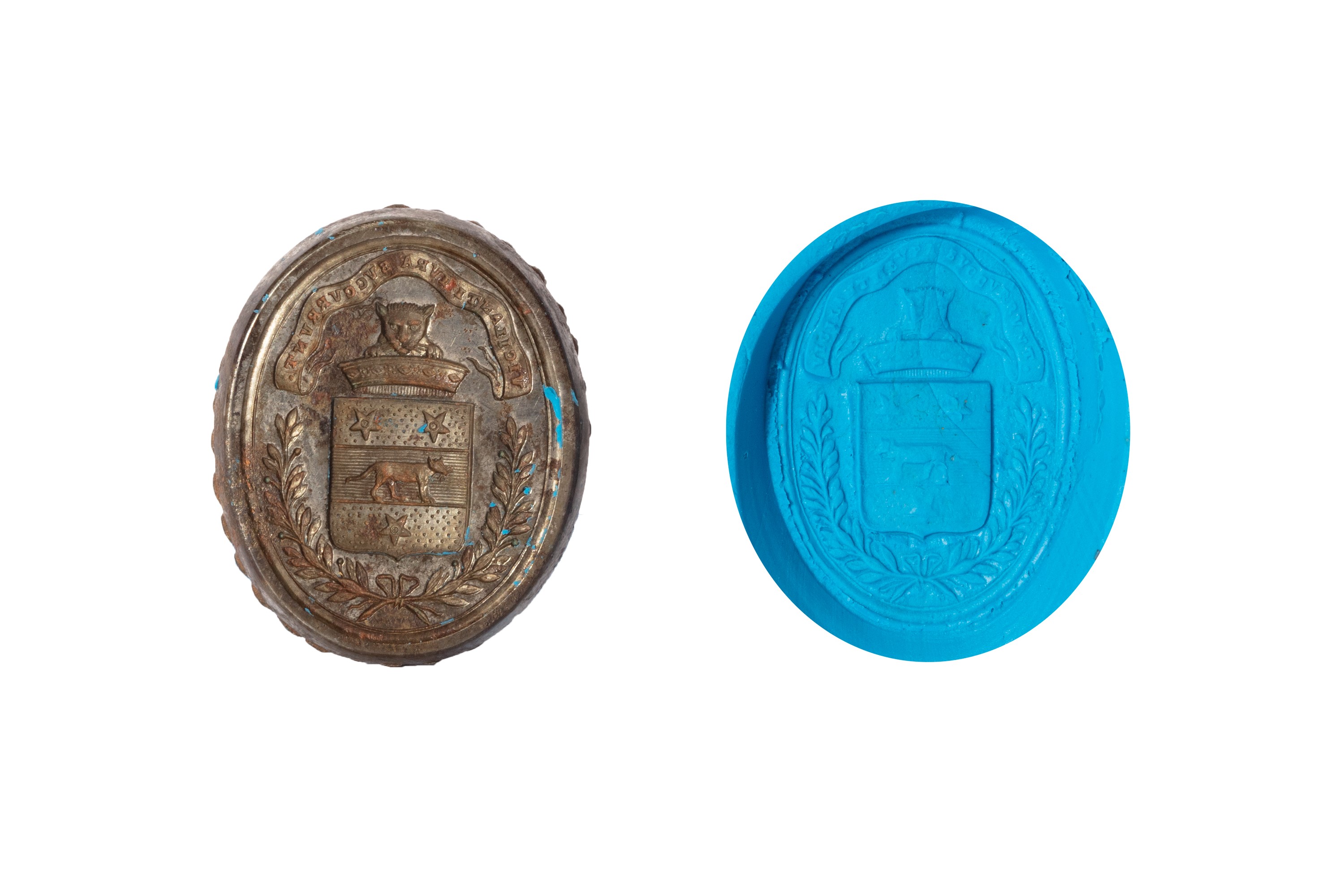 Due sigilli, uno in ferro con stemma nobiliare e motto, e uno multiplo in metallo [..]