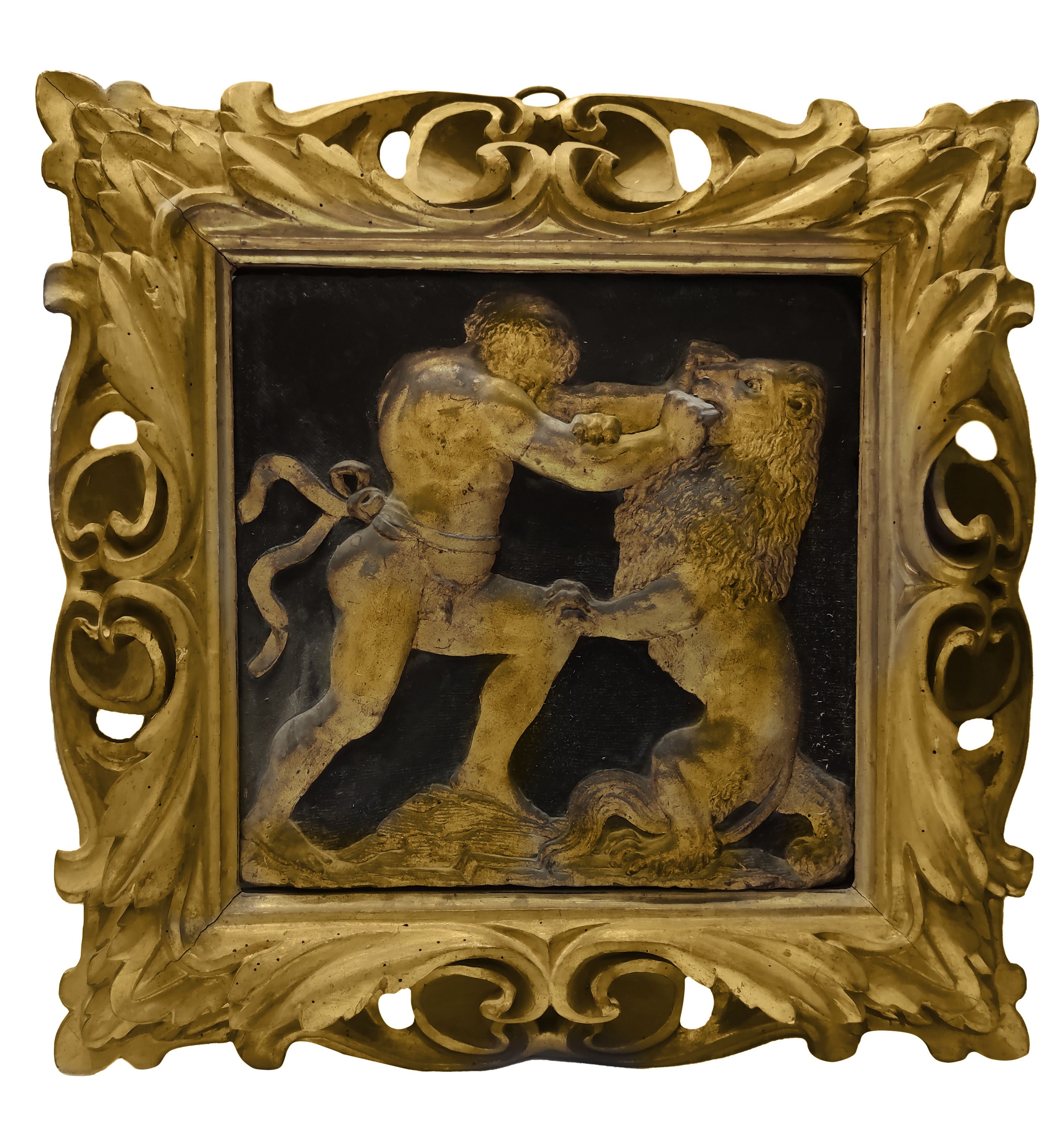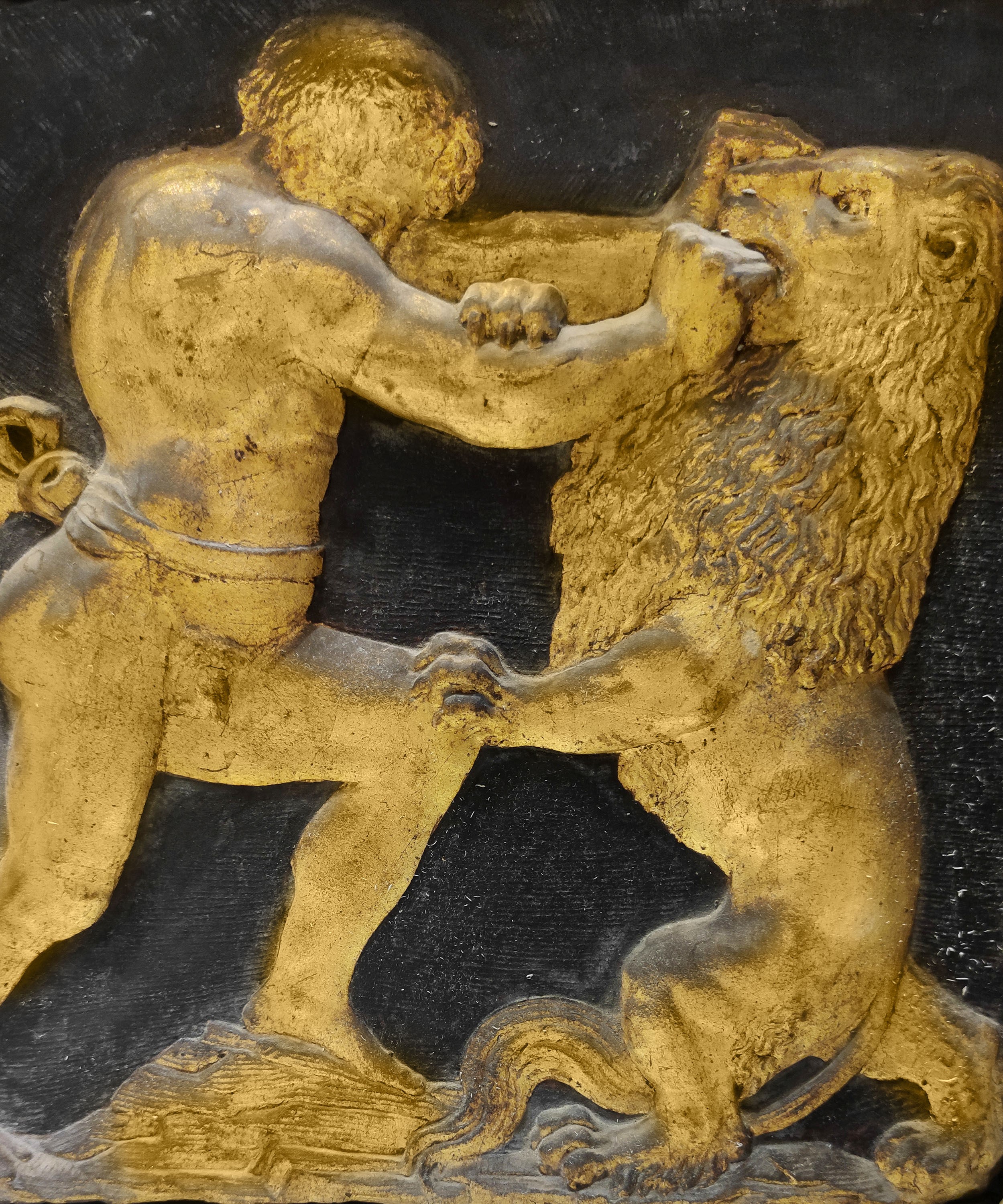 bassorilievo in marmo dipinto a fondo scuro e figure dorate