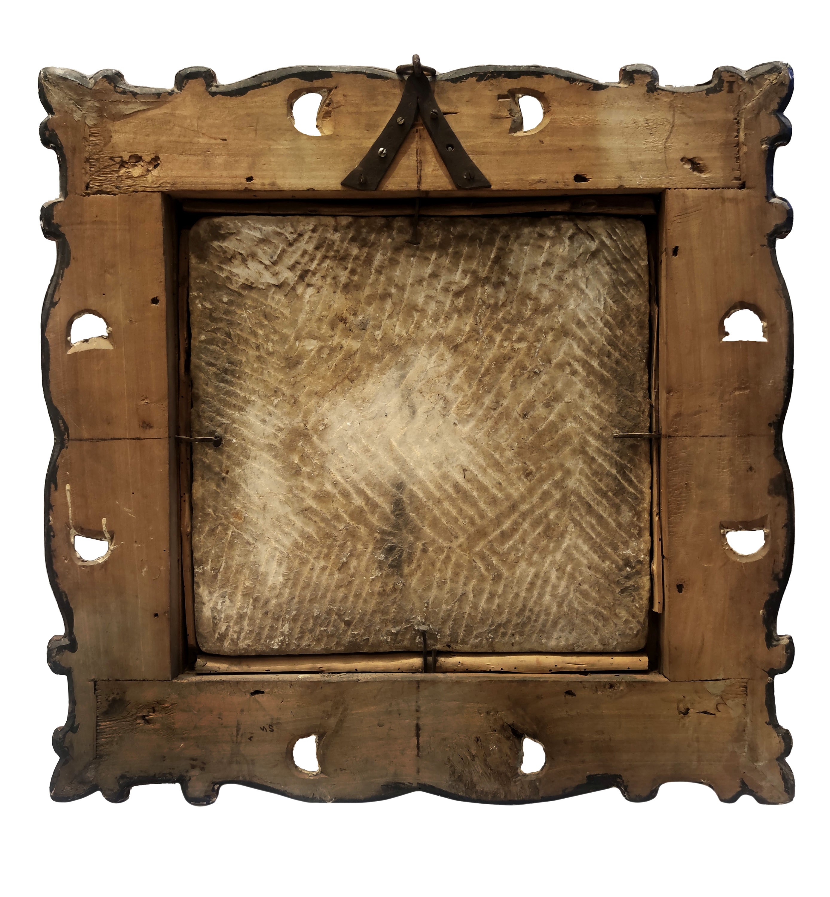entro cornice Toscana del secolo XVII decorata a volute e racemi, in lacca rossa e oro