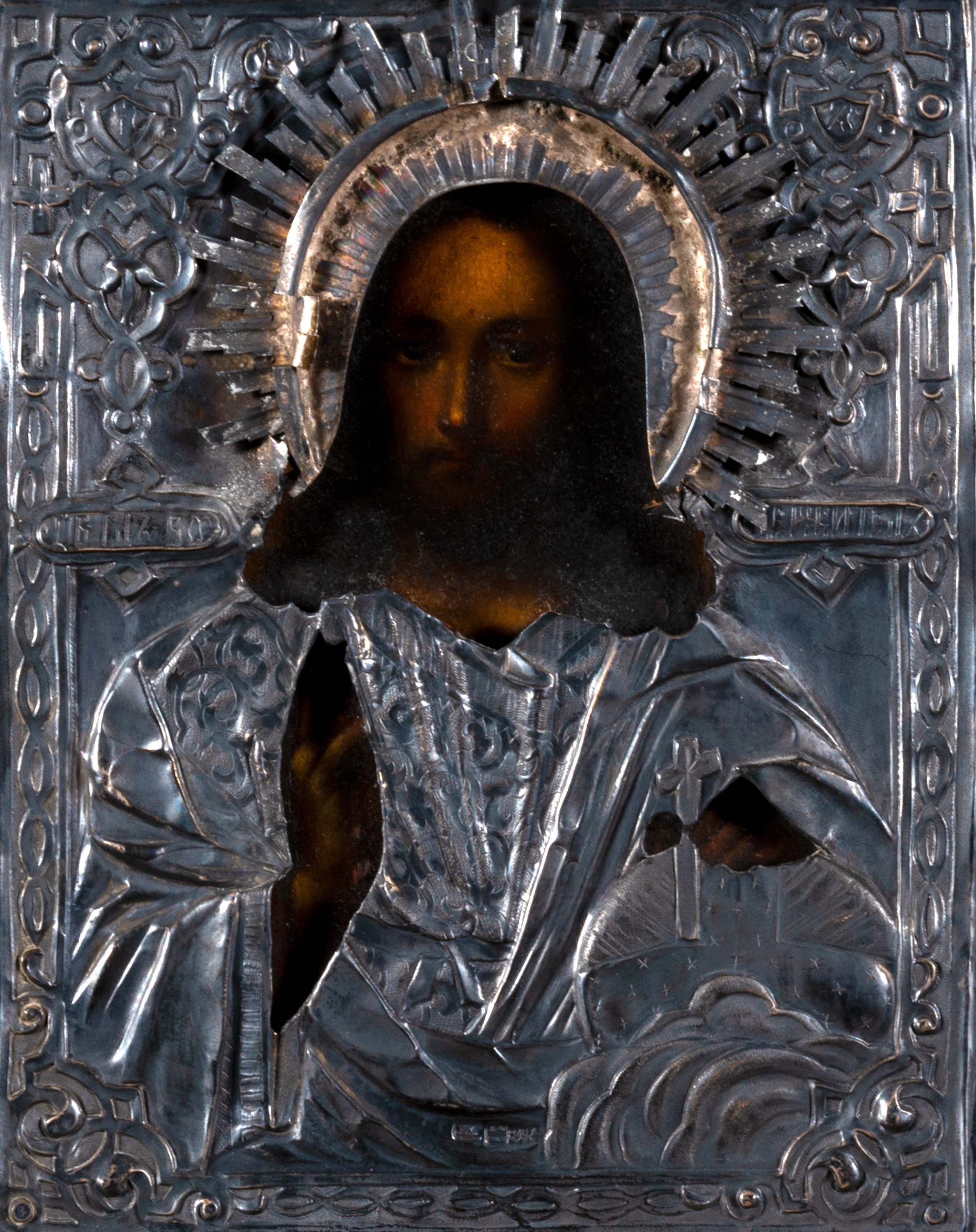 Icona russa raffigurante Cristo benedicente, con riza in argento, secolo XIX