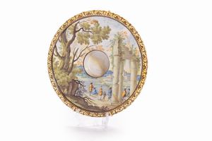 altezza cm 3,3; diametro cm 18 raffigurante paesaggio con capriccio architettonico restauri