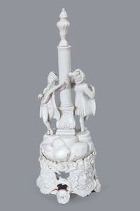 cm 85,5 x 37 il corpo superiore decorato con teste di leone e grottesche, al centro due clipei con Muse, la base [..]