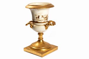 altezza cm 46; diametro cm 28 decorata con teste di ariete sui manici e scena campestre dipinta sul corpo