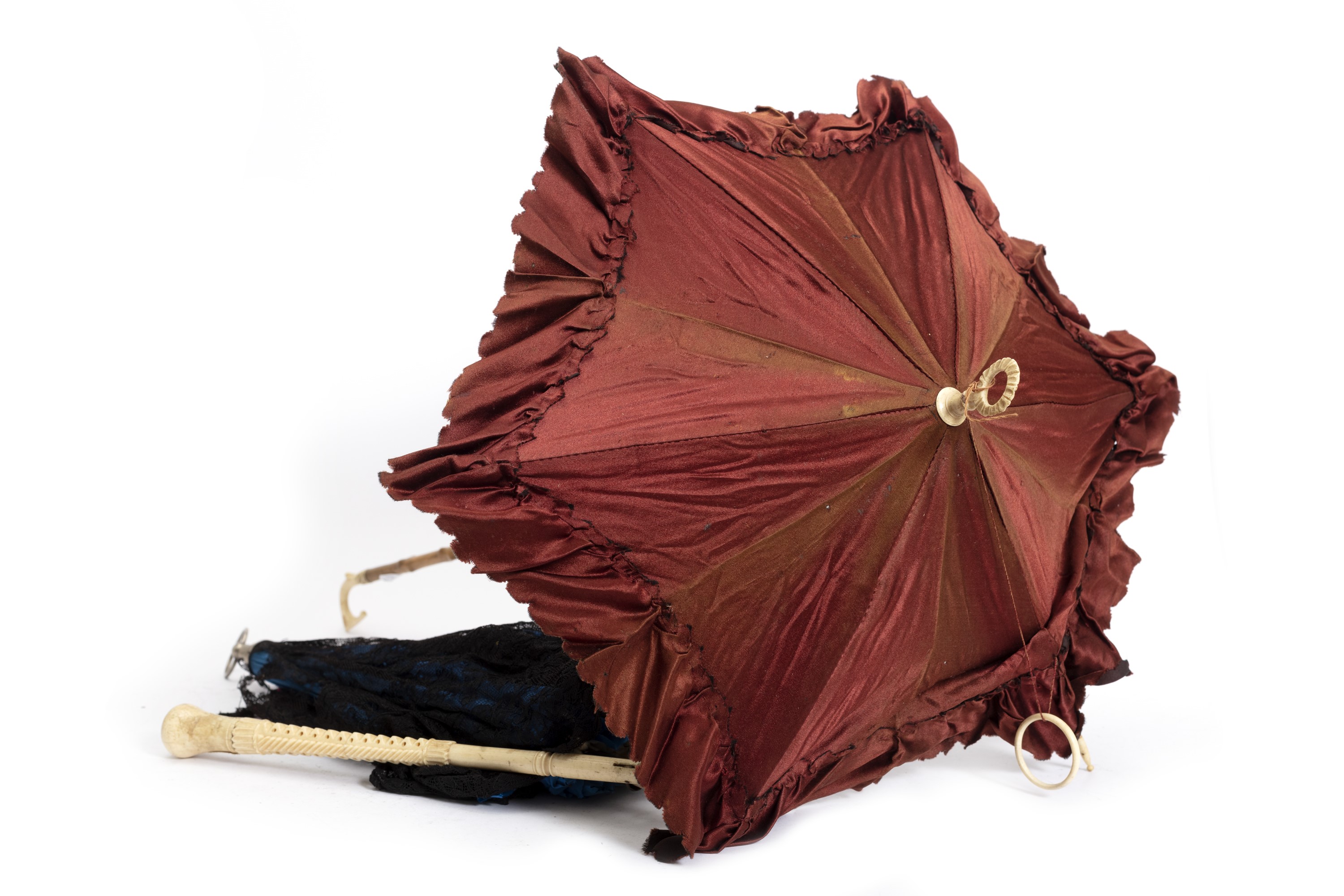 Lotto composto da due ombrellini da bambola con prese in osso, e uno da passeggio [..]