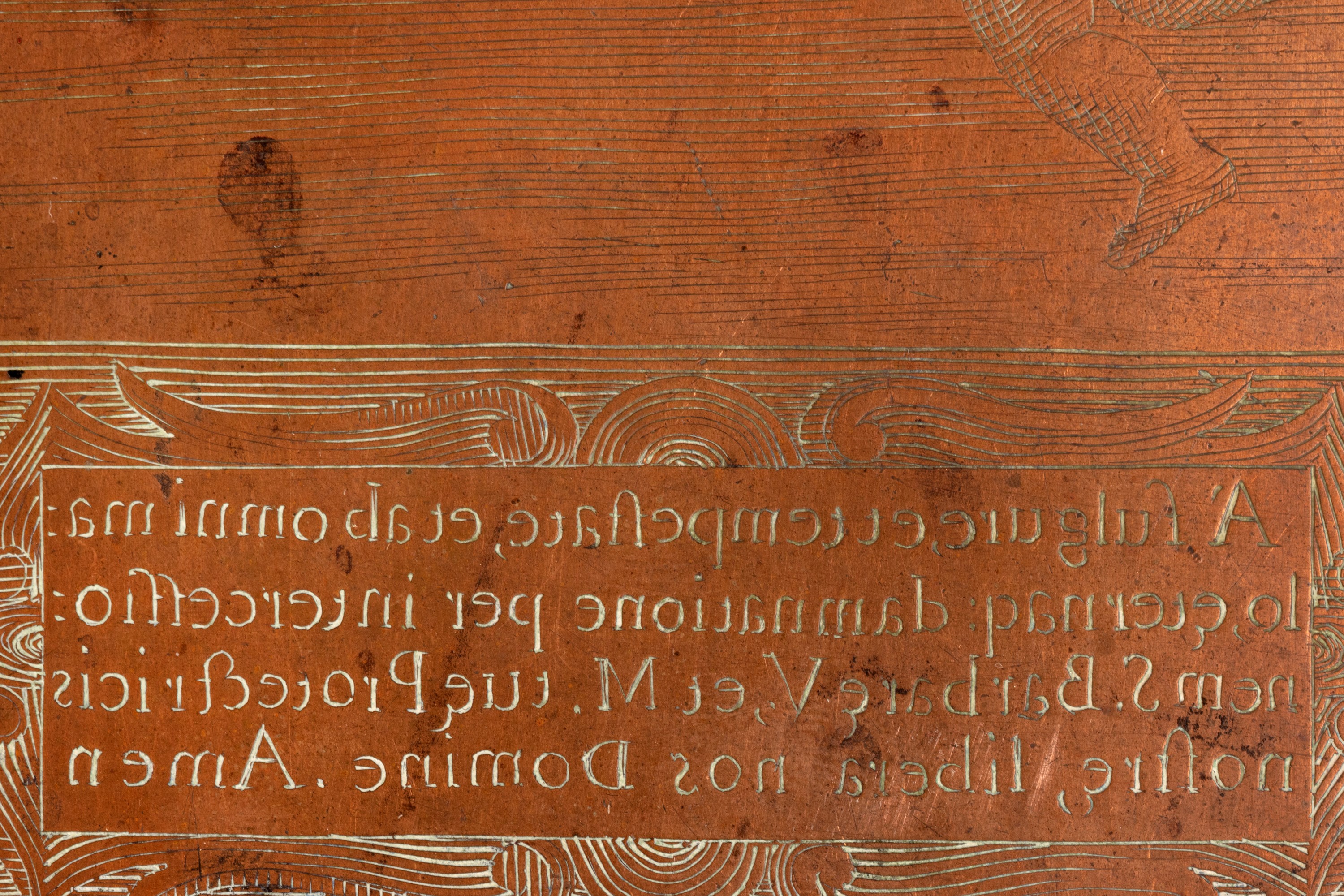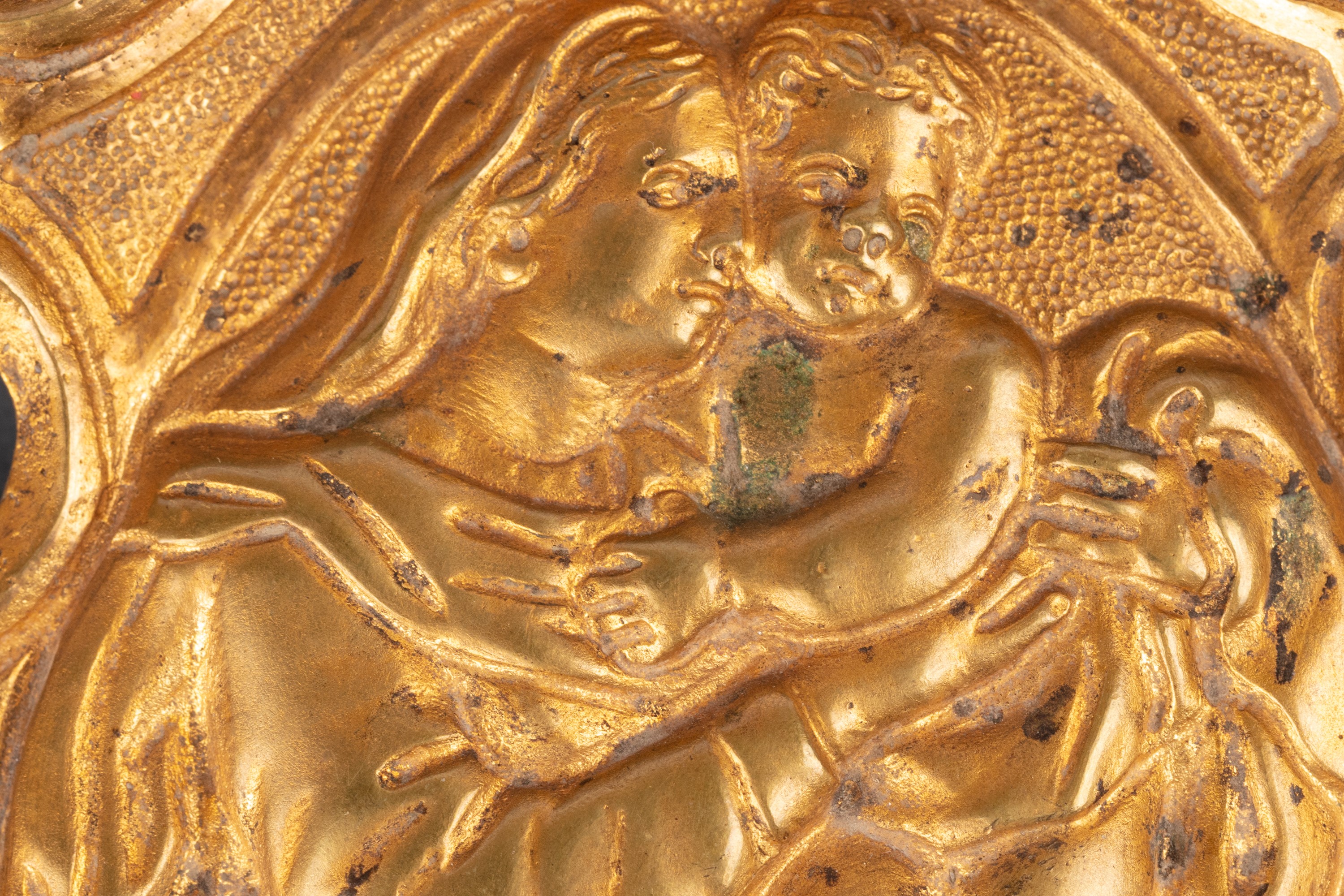 altezza cm 13 (la più grande) e cm 10,8 (la più piccola) la placca più grande in bronzo dorato raffigurante Madonna con Bambino entro cartiglio; una placca ovale raffigurante Compianto di Cristo; la lastra da incisione raffigurante Madonna Assunta in controparte