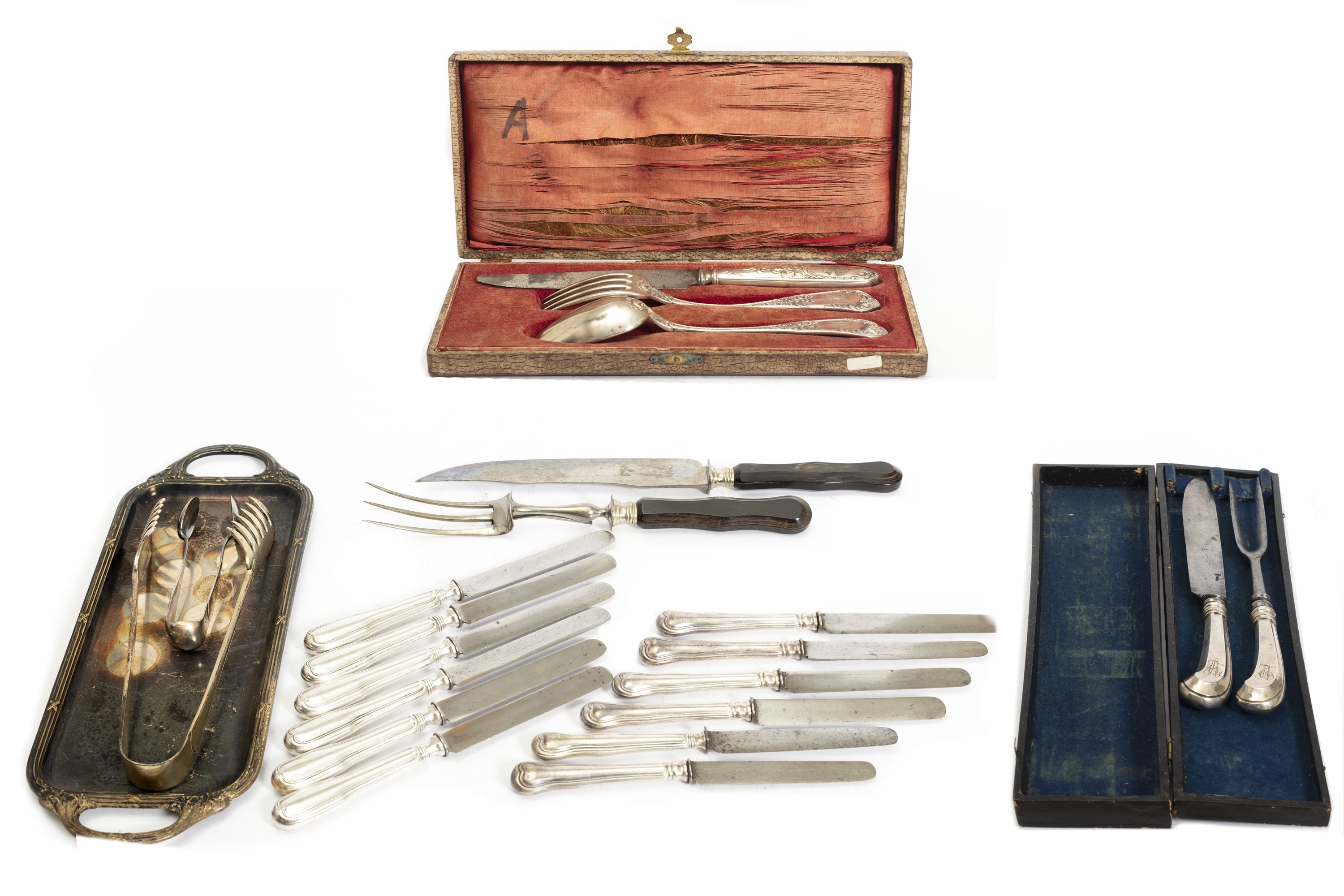 cm 26,5 (il più grande) e cm 13,5 (il più piccolo) un servizio composto da cucchiaio, forchetta e coltello (non pertinente) in astuccio originale; 6 coltelli in argento (uno con monogramma diverso); 6 coltelli in metallo; due servizi da arrosto (uno con manici in corno); una molletta prendi zucchero; una pinza da insalata; un piccolo vassoio