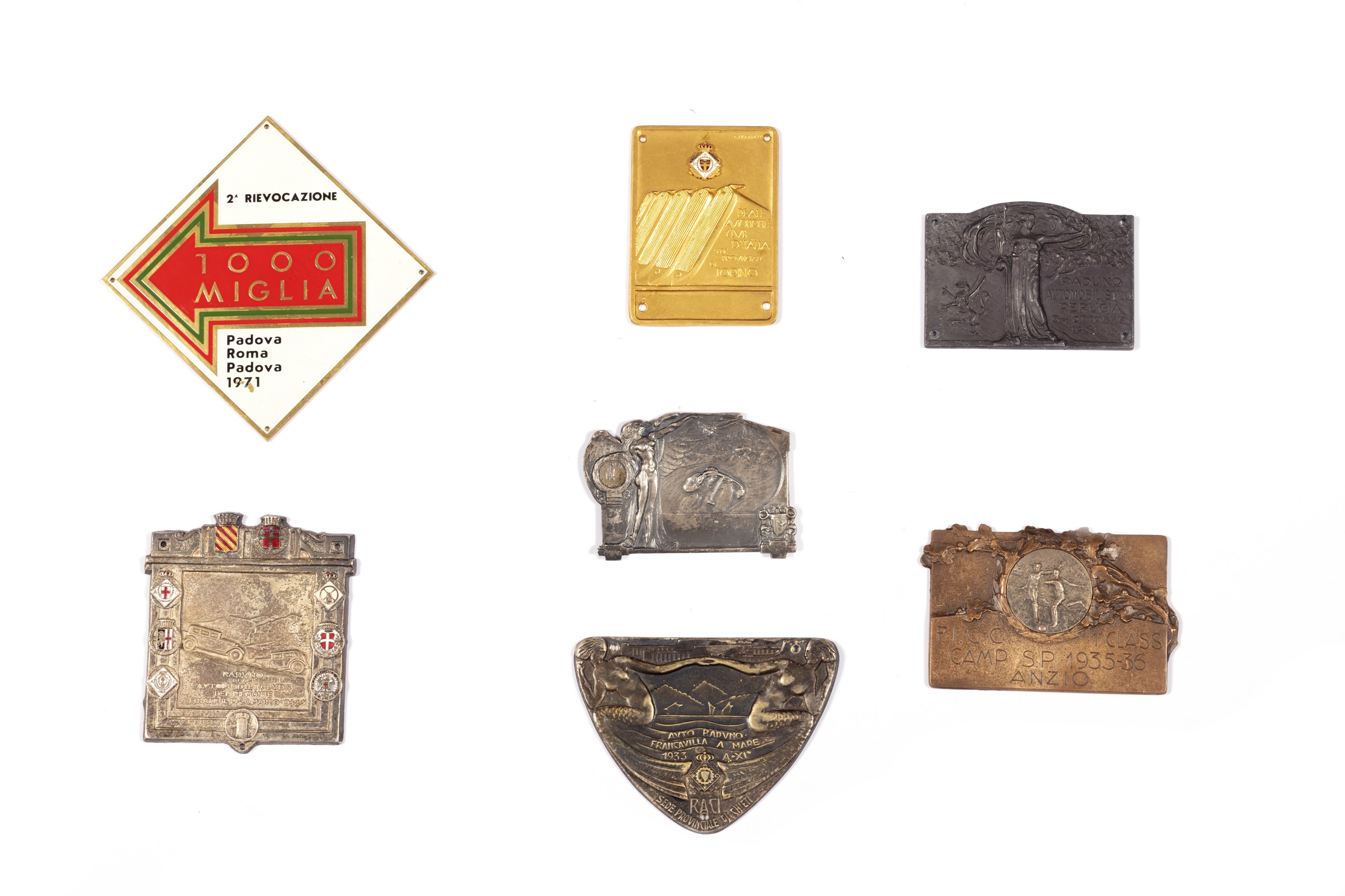 una a forma romboidale della II Rievocazione 1000 Miglia Padova- Roma 1971; una con figura femminile e ciclista; una del RACI Torino, firmata C. Biscaretti; una dell'Autoraduno Francavilla al Mare 1933; una del Raduno Automobilistico Perugia 3-4 ottobre 1931; una del Raduno degli Automobili Clubs del Piemonte, Finale 19-20 marzo 1932; una FIGC I class. Camp. S.P. 1935 - 36 Anzio