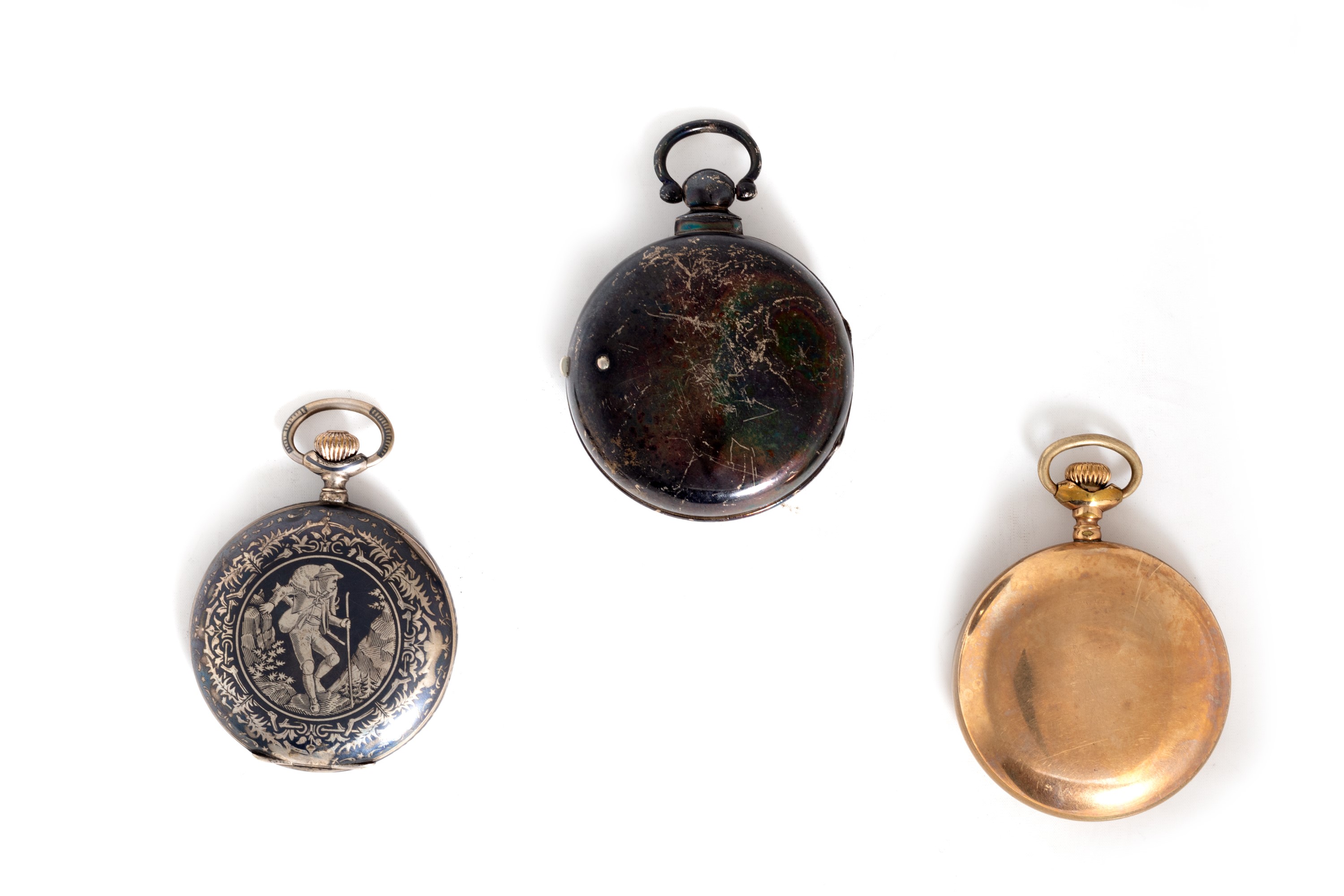 uno in argento niellato a doppia cassa, firmato sul quadrante Chablonen Watch, secolo XIX; uno a verga in argento, Inghilterra fine secolo XVIII; uno in metallo dorato con monogramma E sul quadrante, secolo XIX