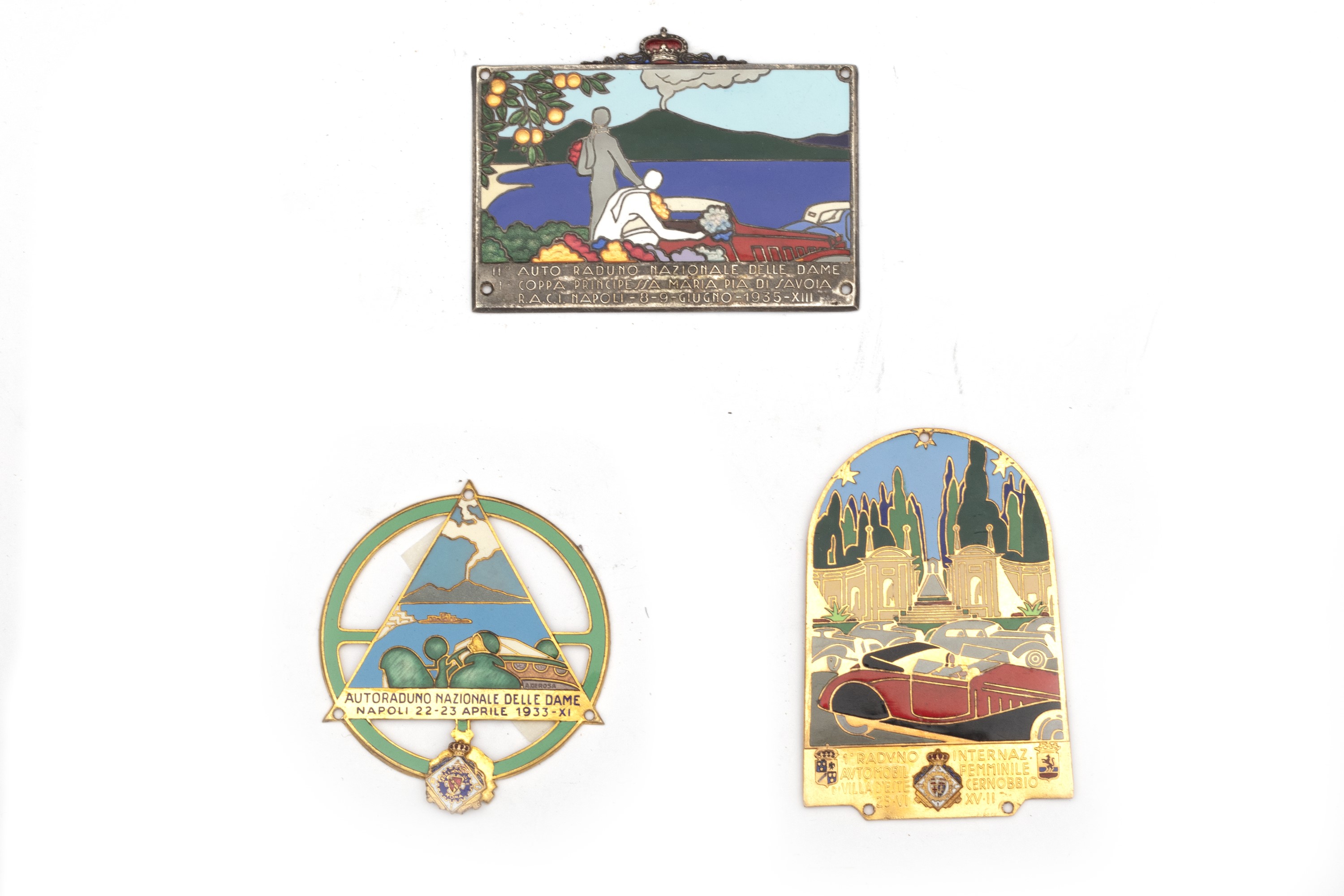 cm 6,2 x 8,5 (la più grande) e cm 7,3 x 6,2 (la più piccola) due dell'Autoraduno Nazionale delle Dame, Coppa Principessa Maria Pia di Savoia, Napoli 22-23 aprile 1933 e 8-9 giugno 1935; una del I Raduno Internazionale Automobilistico Femminile di Villa D'Este a Cernobbio, 25. VI - XV. II
