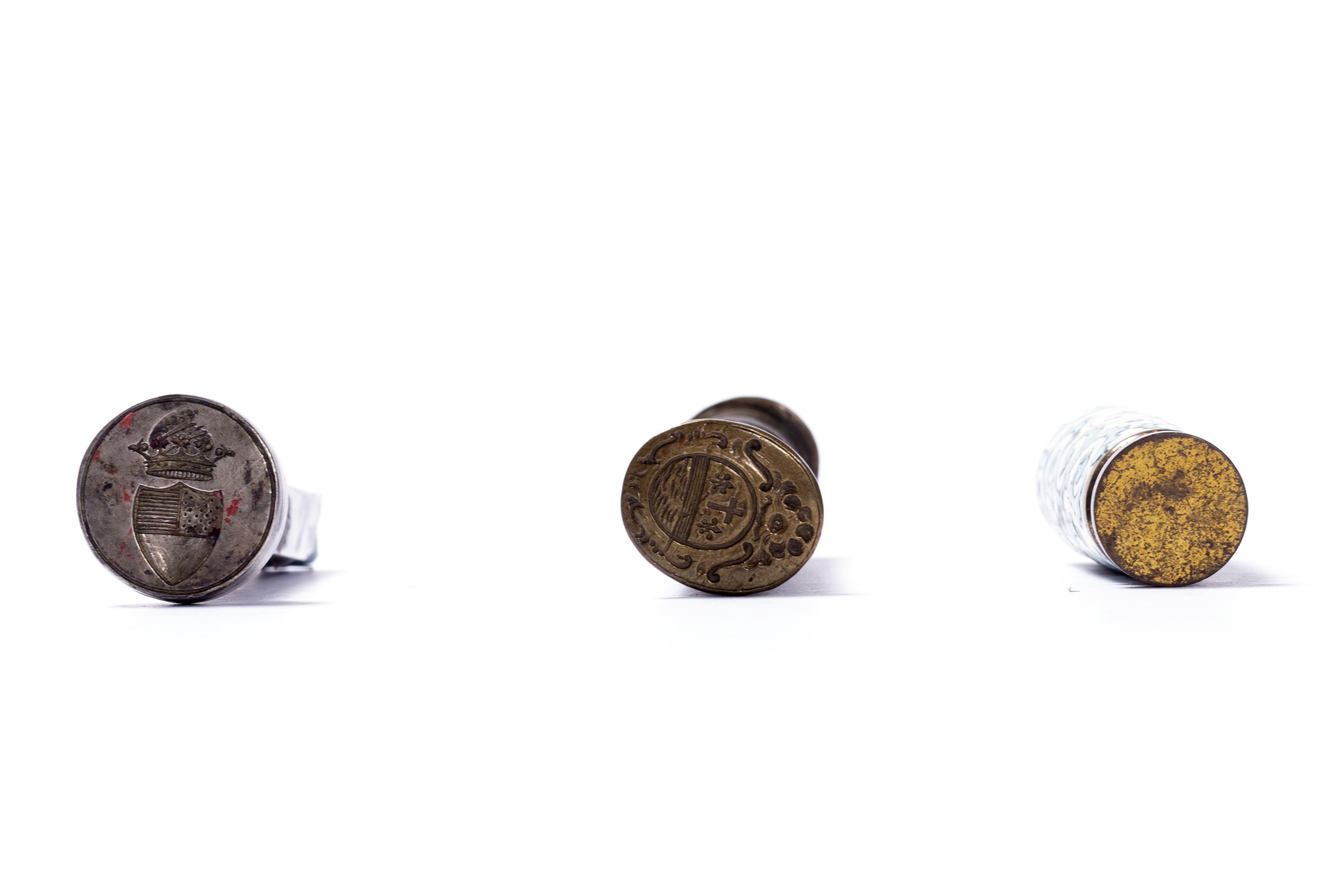 uno con manico in porcellana policroma e base non incisa; uno in argento inglese; uno doppio in bronzo con porta ceralacca all'interno