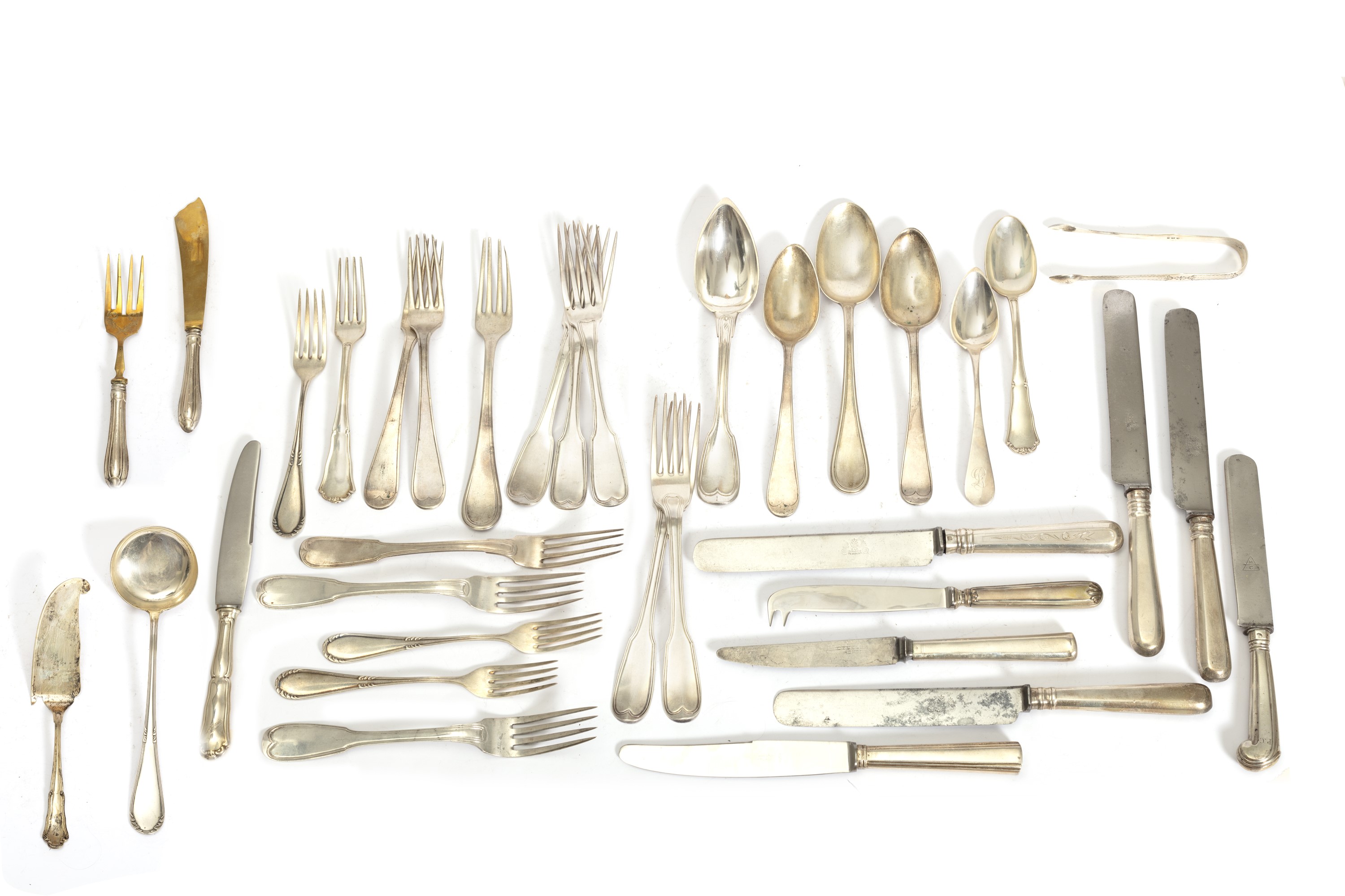 9 coltelli di misure diverse, un coltello e una forchetta da pesce da portata, 15 forchette di misure diverse, 6 cucchiai di misure diverse, una molletta prendizucchero, una paletta e un mestolo