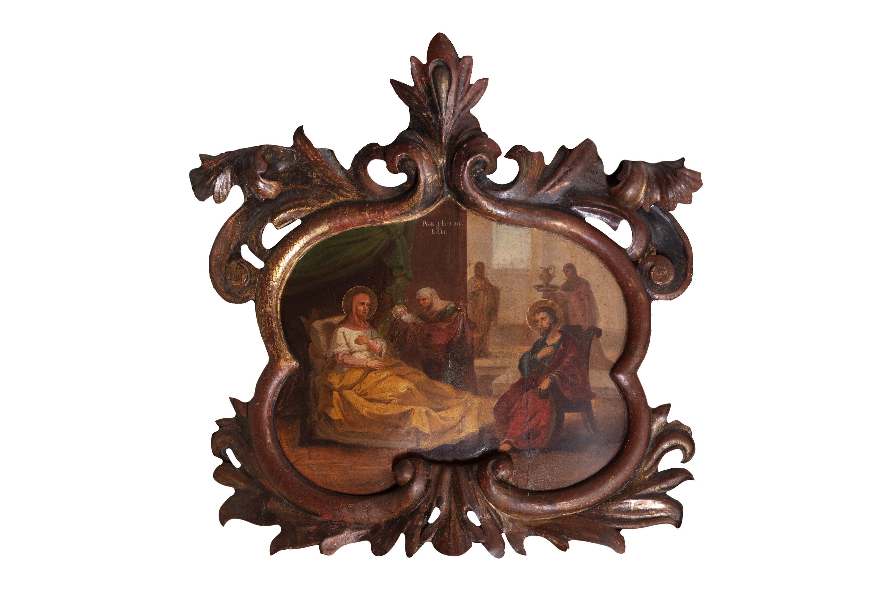 olio su tavola, entro sagoma mistilinea decorata a racemi, cm 61 x 56,5