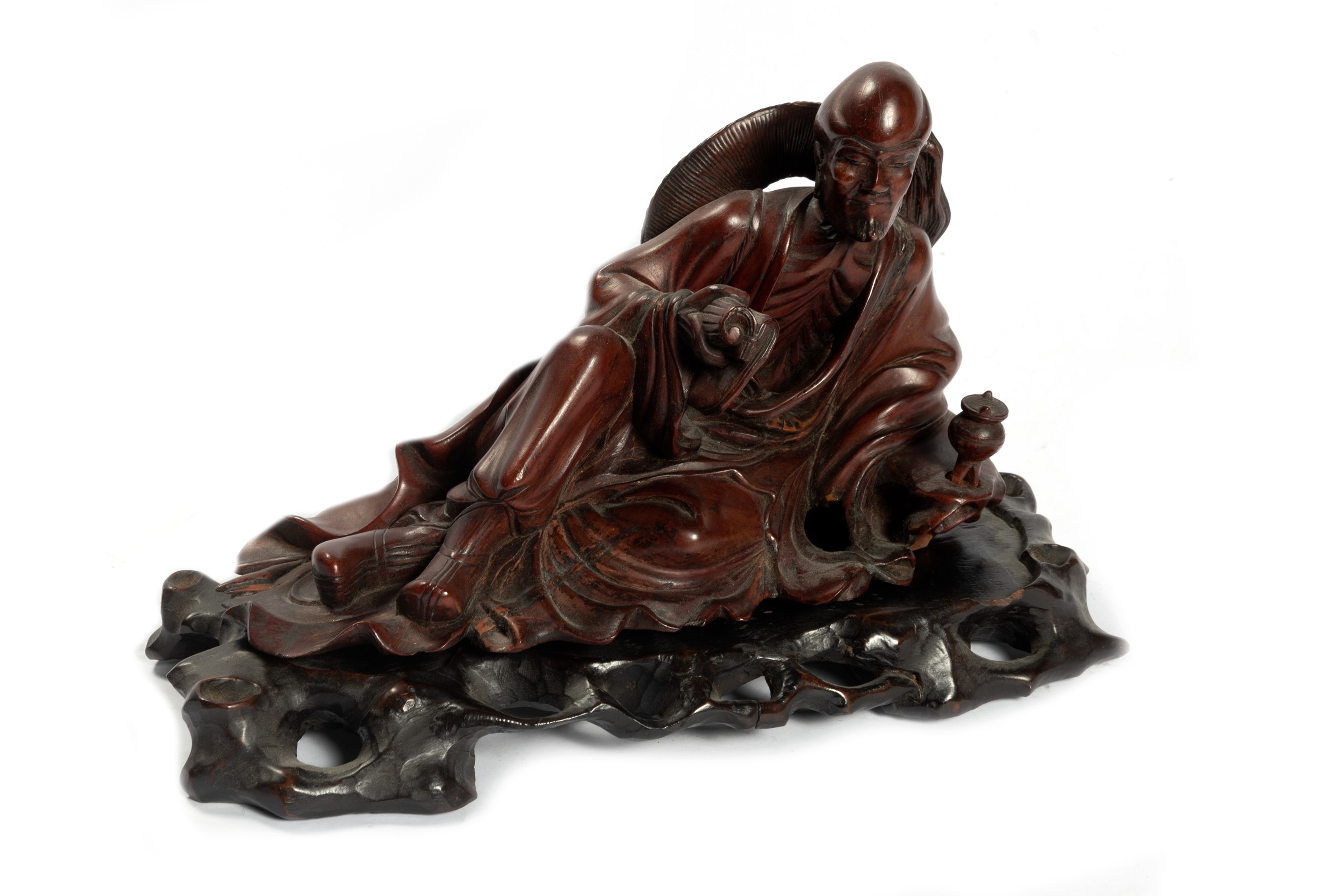 Scultura in legno raffigurante saggio sdraiato, Cina secolo XX