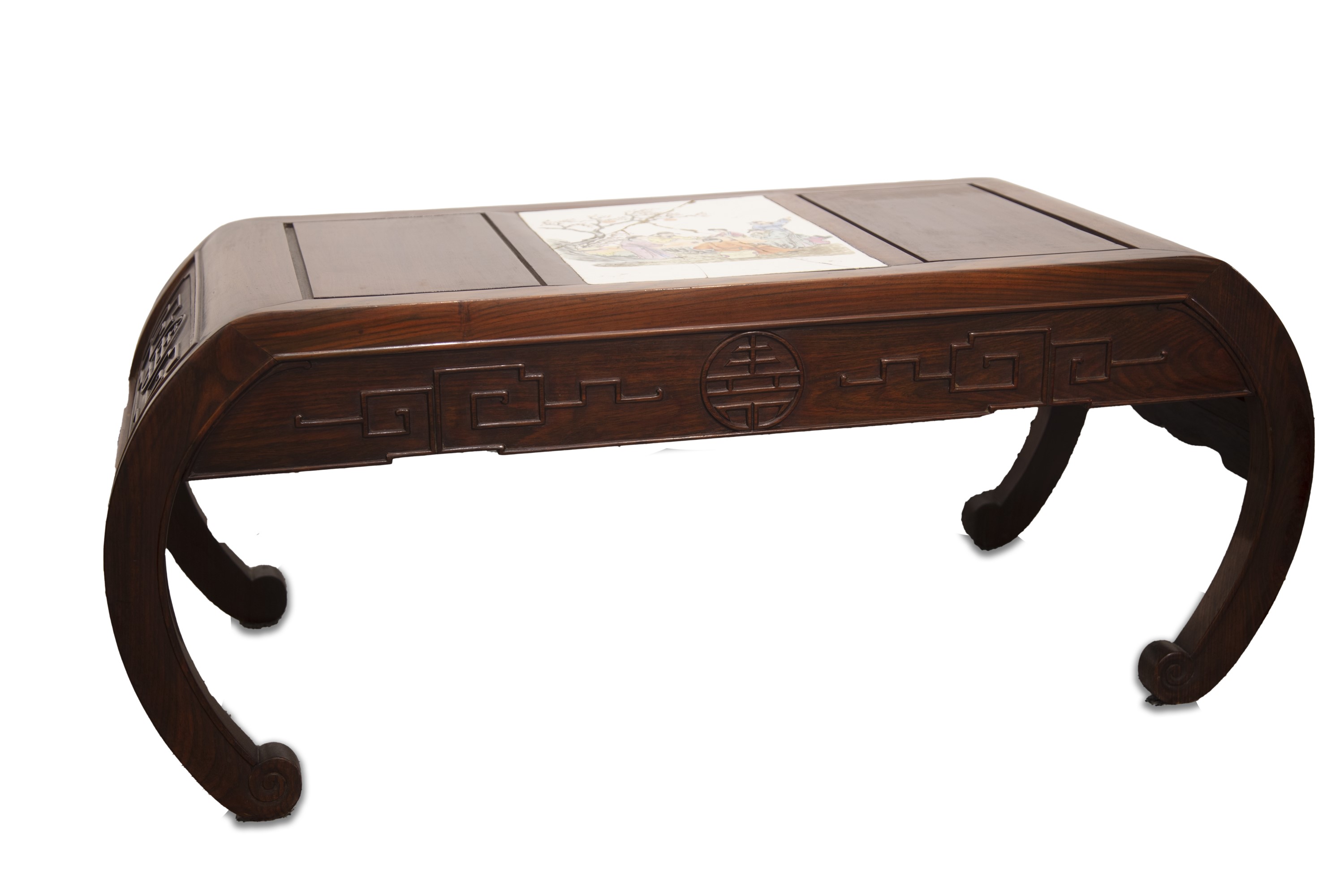 Tavolino in legno con formella di porcellana policroma, Cina dinastia Qing