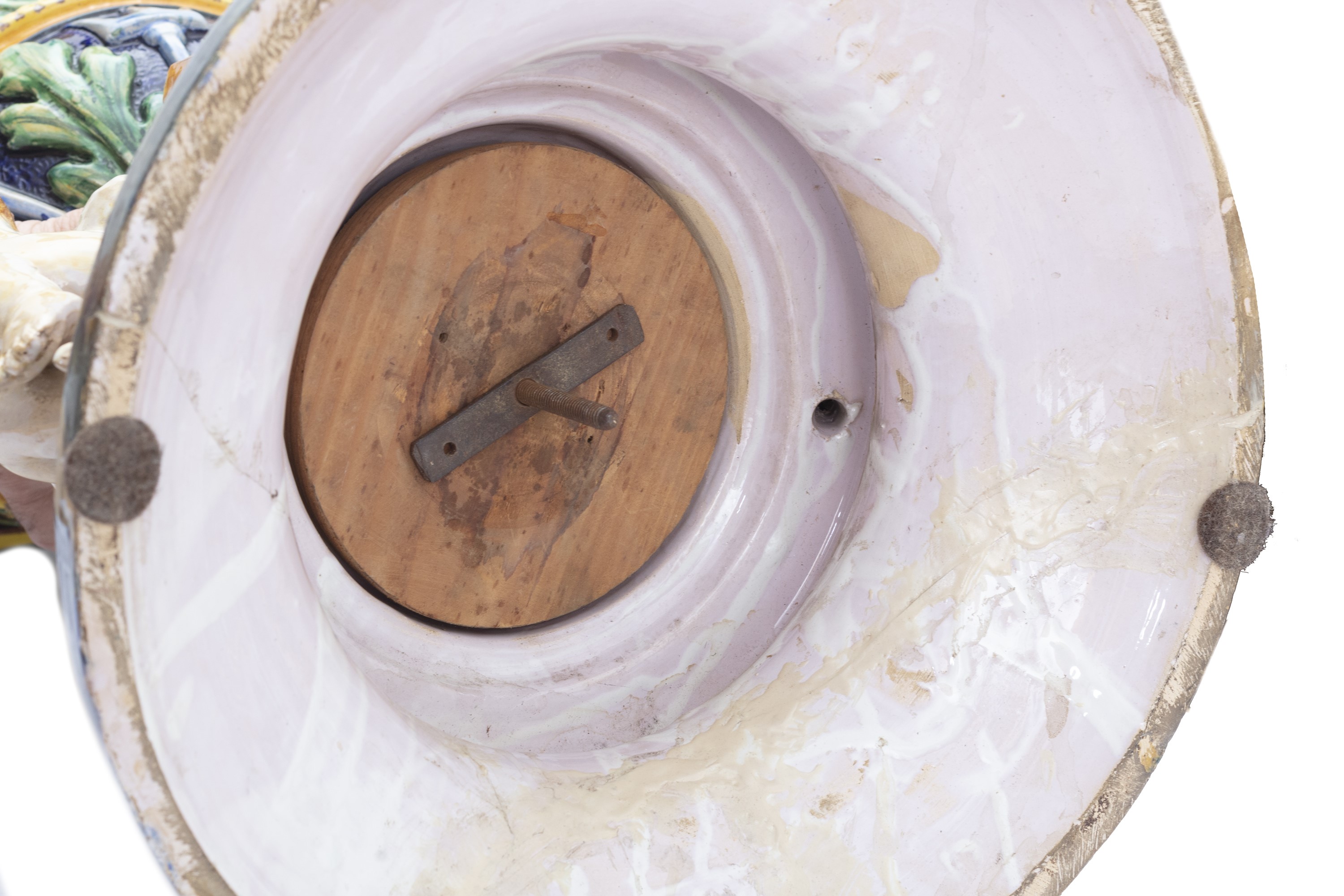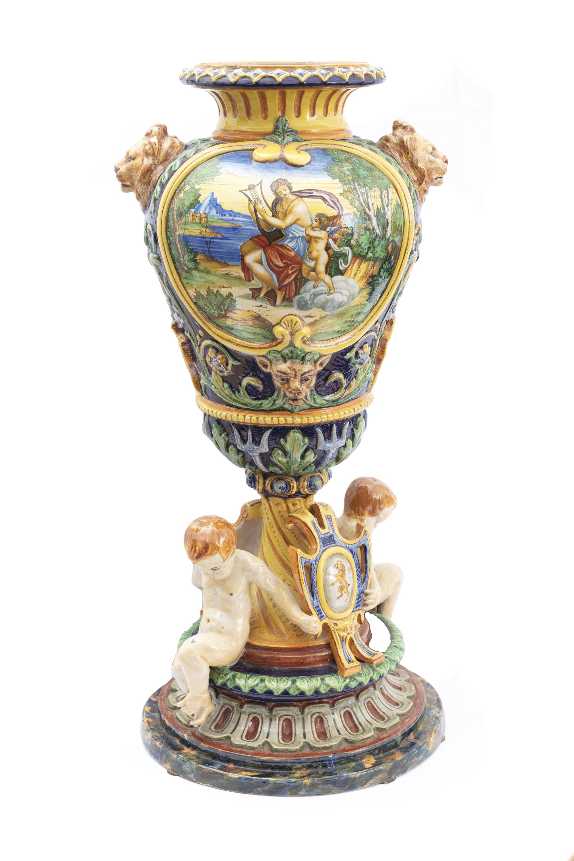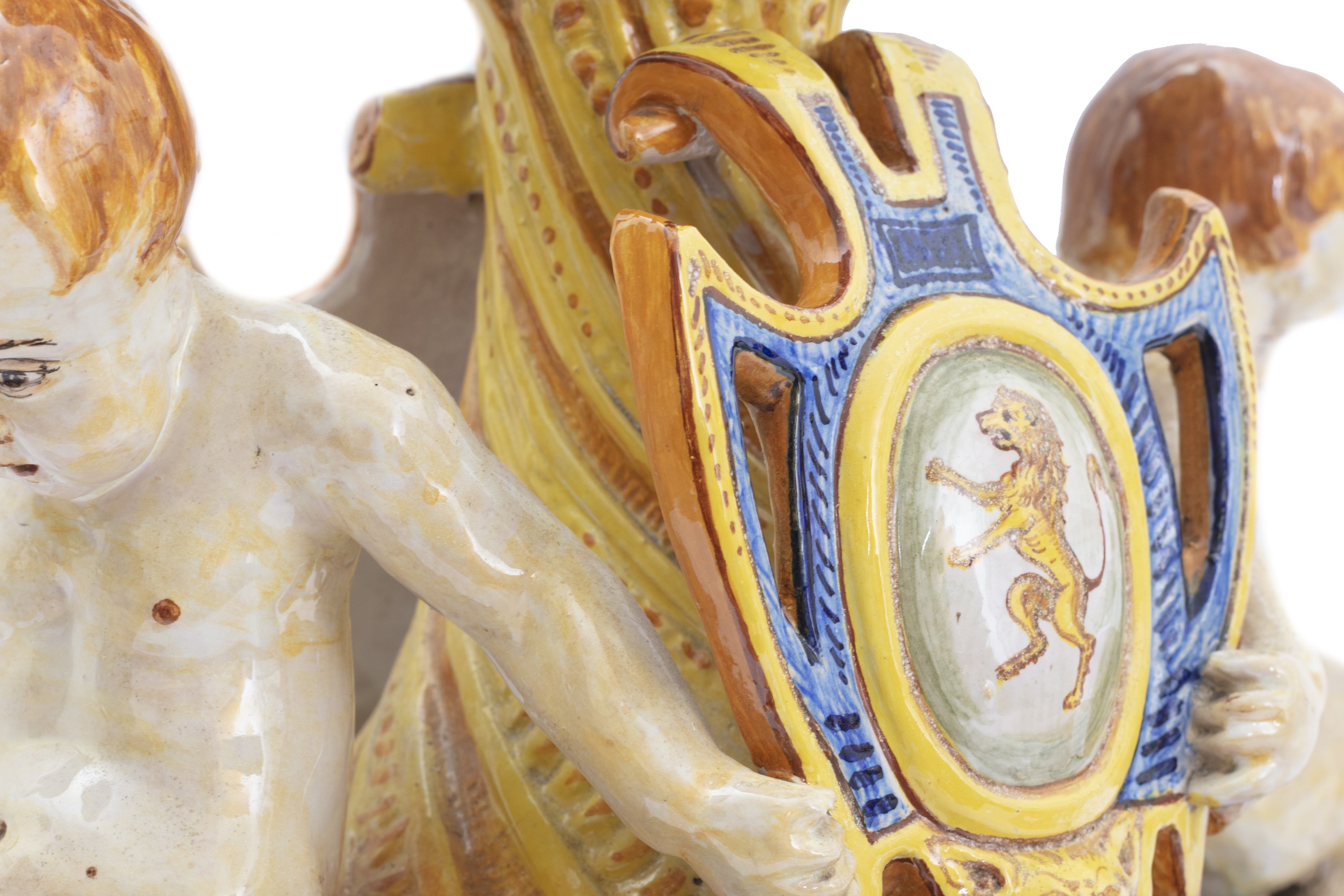 il corpo superiore decorato con teste di leone e grottesche, al centro due clipei con Muse, la base decorata con putti e stemmi