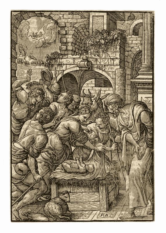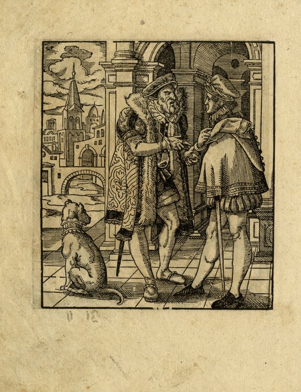 Xilografia. mm 280x192. New Hollstein, 627. Testo latino al verso. In basso spostato a destra il monogramma di Pieter van der Borcht (Bruxelles,1540-Anversa,1608) autore del soggetto. Tavola dal Missale Romanum edito ad Anversa nel 1577 da Christoph Plantin. SI AGGIUNGE: Jost Amman (Zurigo, 1539 – Norimberga, 1591). Due uomini in conversazione su una soglia/Due uomini in conversazione su una soglia con un cane. 1580. Xilografia. mm 123x105/107. New Hollstein, 142. Coppia di xilografie impresse su unico foglio di mm 197x147, tratte dal volume Kunstbüchlein pubblicato a Francoforte sul Meno nel 1580 da Sigmund Feierabend. Carta con parte di filigrana “arme di Augsburg”.
