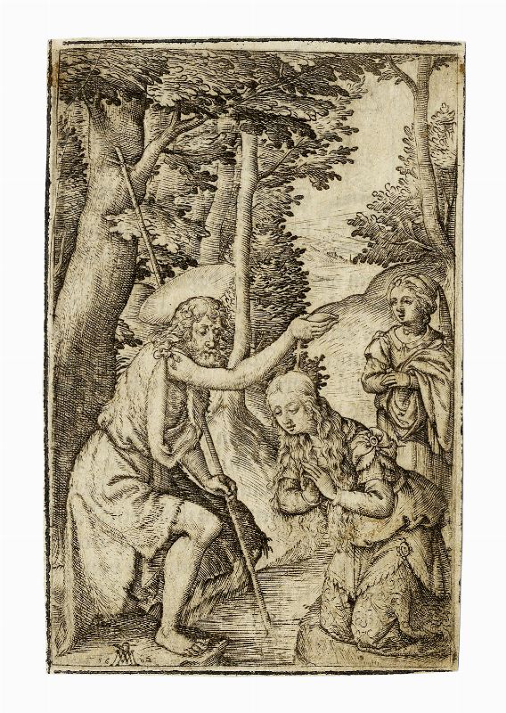 Bulino. mm 63x60. Con il supporto: mm 115x78. Con il titolo, il monogramma e la data "1576" al margine inferiore.Bellissima impressione su carta vergellata sottile. SI AGGIUNGE: Martinus Martini (Rinkenberg, 1566-Liguria, 1610). Giovanni Battista battezza Marta. 1602. Bulino. mm 112x73. Le Blanc,II,611. Tavola per Speculum poenitentiae. Artista ecclettico e raffinato, fu orafo, geometra e incisore; lavorò a Lucerna e in Italia. Esemplare fresco e ben conservato con testo tedesco al verso, impresso su carta sottile vergellata. Al verso timbro collezione Caironi (Lugt,426).