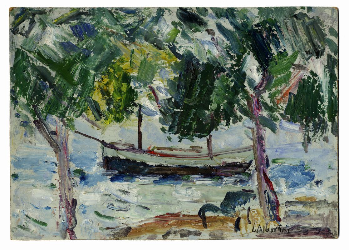 Tempera su masonite. cm 25x34,5. Firma in basso a destra. Al verso targhetta della mostra personale dell'artista presso la Galleria Casanuova Trieste.
