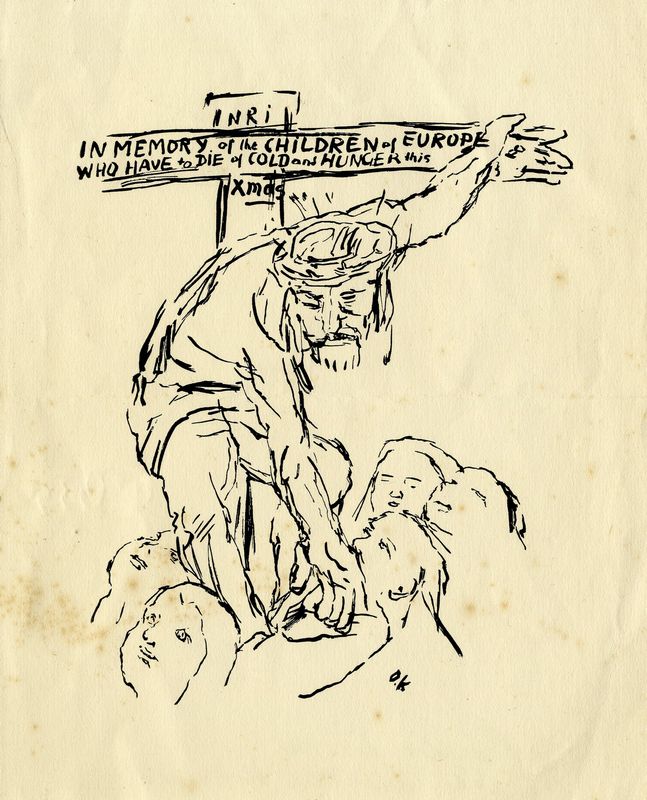 Biglietto d'auguri della coppia Kokoschka su riproduzione di una delle celebri incisioni dell'artista. mm 205x165.