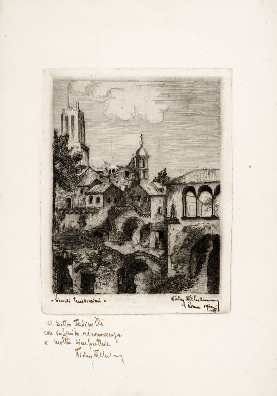 Acquaforte. mm 650x490. Foglio: mm 855x605. Firmata a matira in basso a destra, titolata e numerata in basso a sinistra, siglata in lastra. Es. 7/50. SI AGGIUNGE: 2) Artista da studiare, Ricordi tenerissimi. 1940. Acquaforte. mm 295x230. Foglio: mm 500x350. Firmata, titolata, datata e dedicata a penna e inchiostro di china in basso.