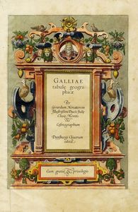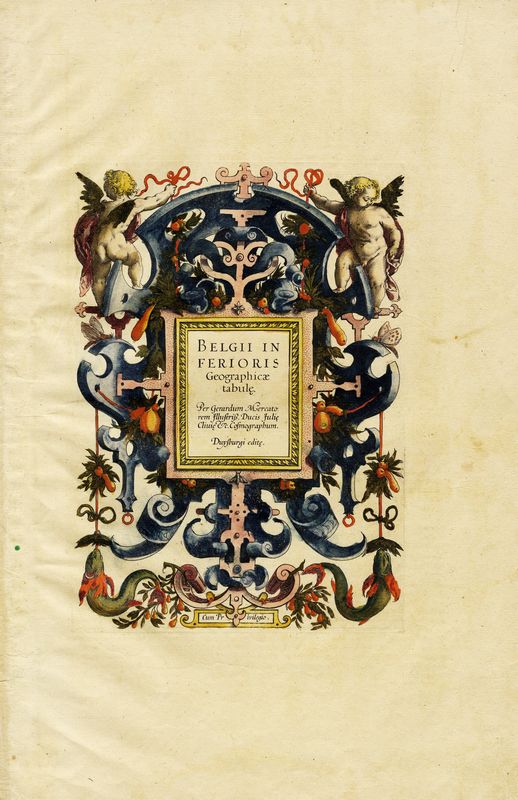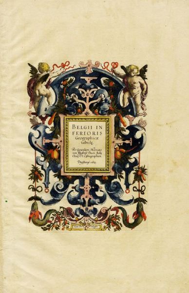 Acquaforte e bulino in coloritura. mm 225/315x160/223. Foglio: mm 400x270. Lotto di cinque frontespizi da Atlas sive Cosmographicae Meditationes.../ Germaniae tabule geographicae / Galliae tabulae geographicae / Atlantis Pars altera Geographia Nova Totius Mundi / Belgii Inferioris.