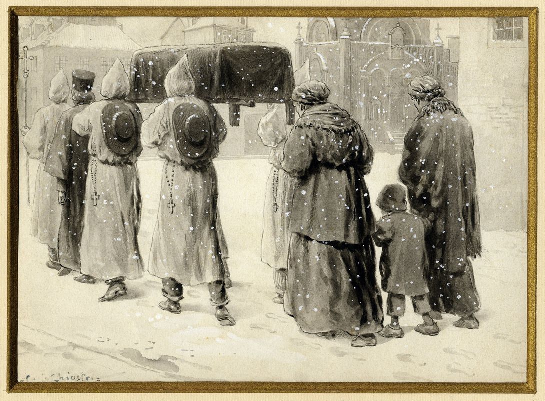Penna, inchiostro acquerellato e tocchi di tempera bianca su cartoncino. mm 235x350. Firmato a penna e inchiostro di china in basso a sinistra. Acquerello originale del Chiostri per un' illustrazione del libro Bambino di gomma elastica (di D. V. Grigorovi, Firenze 1910).