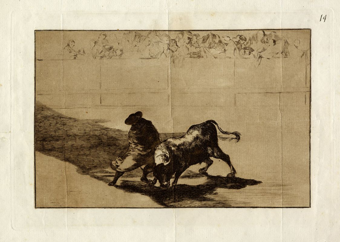 Acquaforte, acquatinta e puntasecca. mm 247x352. Foglio: mm 320x418. Harris, 217. Con il numero "14" in alto a destra. Quattordicesima tavola da La tauromachia, serie pubblicata per la prima volta da Goya nel 1816 in trentatre tavole. Bella prova su carta vergata color crema nella tiratura moderna della Calcografia Nacional del 1983, come da timbro a secco in basso a destra.