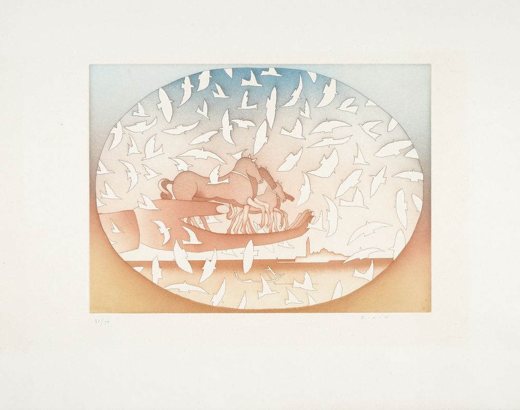 Acquatinta. mm 295x405. Foglio: mm 510x655. Firmata a matita in basso a destra e numerata in basso a sinistra. Entro cartella editoriale originale. Es. 40/50.