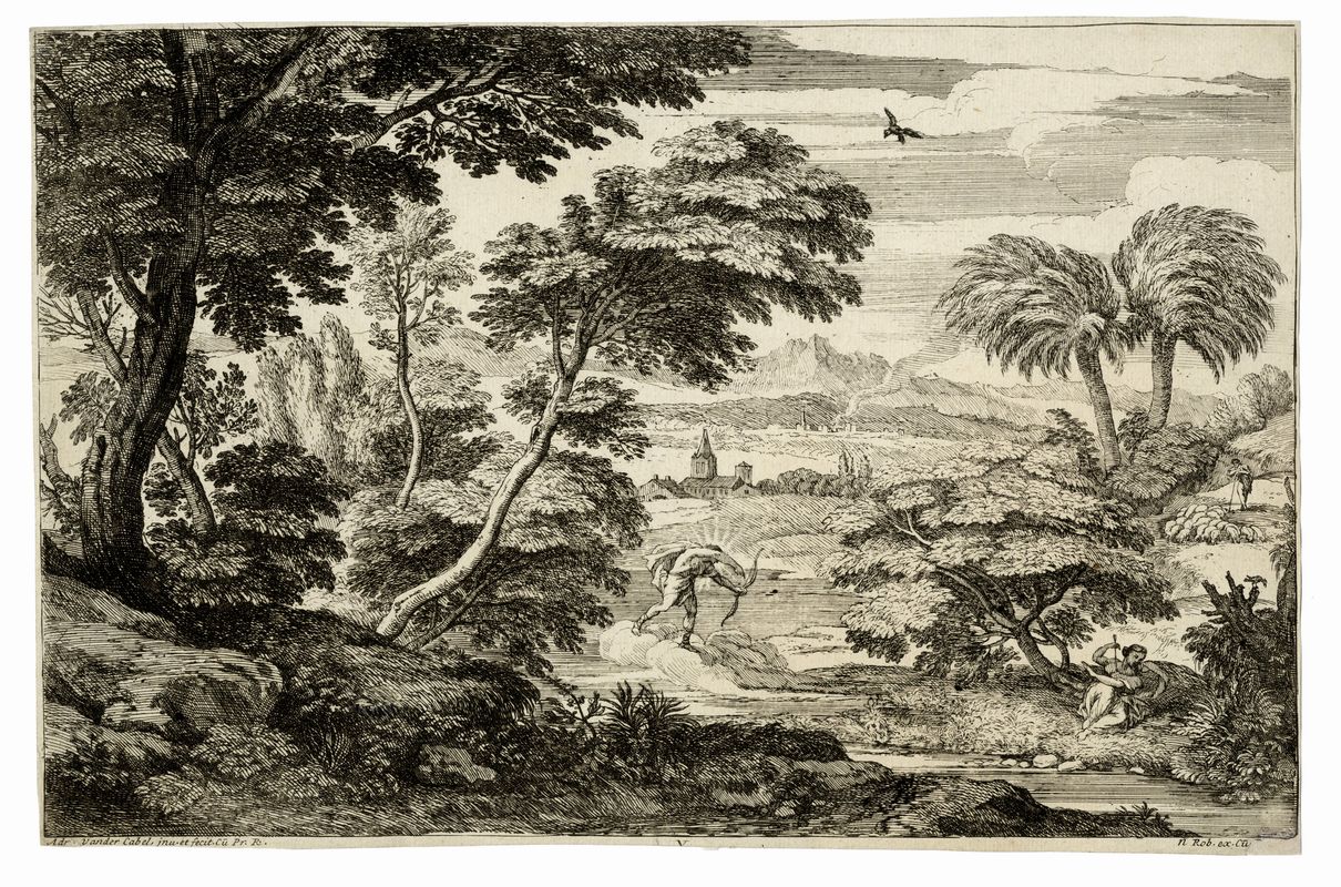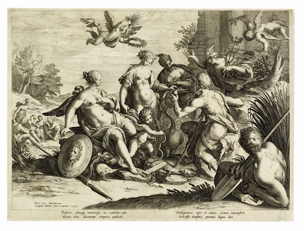 Bulino. mm 290x379. Foglio: mm 292x390. New Hollstein, 45. Da un soggetto di Hans von Achen. Firmata e datata in basso a sinistra "Raphael Sadeler fecit et excudit 1589". SI AGGIUNGONO: n. 10 paesaggi arcadici con soggetti a tema mitologico di Adriaen van der Cabel (Rijswijk, 1630 o 1631 – Lione, 1705), Adriaen van Nieulandt (Anversa, 1587 – Amsterdam, 1658), Adam Pérelle (Parigi,1640–1695), Jean Le Pautre o Lepautre (Parigi, 1618 – 1682) e da Paul Bril (Anversa, 1554 – Roma, 1626) .