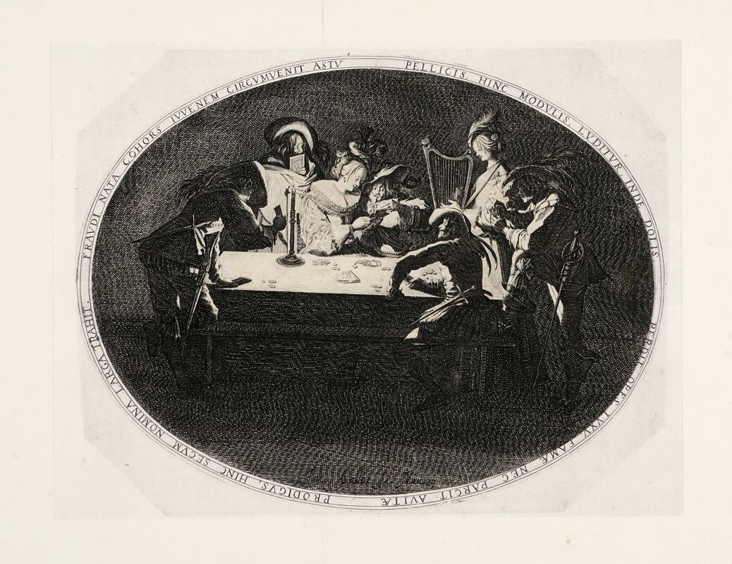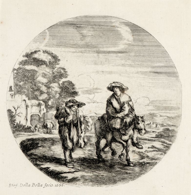 Acquaforte. mm478x303. DeVesme/Massar, 73. Bellissima impressione nel III stato di 8 su carta vergellata con filigrana "grappolo d'uva". SI AGGIUNGONO: Id., Caccia al daino. Acquaforte. mm 150x227. Foglio: mm 152x232. DeVesme/Massar, 735. Firmata a puntasecca “SDBella” a lettere intrecciate nel margine in basso a destra. Quarta tavola da Cacce a differenti animali. Bellissima prova nell’unico stato su carta vergellata apparentemente priva di filigrana. Id., Il Colosseo e l'arco di Costantino. 1646 ca. Acquaforte. mm 128x128. DeVesme/Massar, 827. Nona tavola da Vedute con rovine di Roma e paesaggi.Id.,Contadino a cavallo e altro a piedi.1656. Acquaforte.mm 149x140.DeVesme/Massar, 744. Da Paesaggi e porti di mare in tondo. Jacques Callot (Nancy, 1592-1635). Le Brelan. 1628. Acquaforte e bulino in ovale. mm 263x202 (dimensioni del foglio). Lieure, 596. Bellissima impressione stampata su sottile carta vergellata.