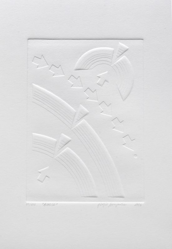 1) Giorgio Bompadre, Bianco. 1993. Acquaforte. mm 180x130. Foglio: mm 290x200. Firma, data, titolo e tiratura a matita in basso. Entro cartella editoriale originale. Es. 67/100. 2) Giovanni Turria, Venti Correnti. 2021, Xilografia. Diam mm 160. Foglio: mm 275x195. Firma, titolo, data e tiratura a matita in basso. Es. 36/100.