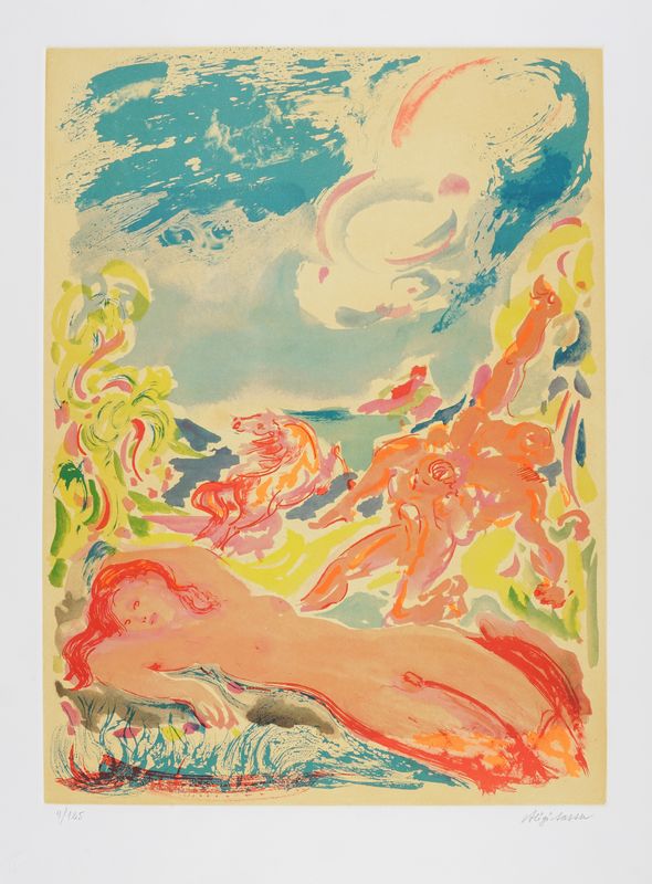 2 incisioni all'acquaforte a colori. mm 635x472 cad. Fogli: mm 765x570 cad. Entrambe firmate a matita in basso a destra e numerate in basso a sinistra. Timbri a secco in basso a destra e a sinistra timbro a secco de "e ne l'incendio d'una fredda stampa" in basso a sinistra di entrambe le incisioni.