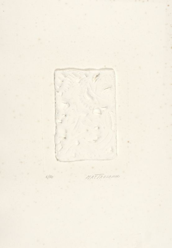 1) Bianco. Incisione a secco sbalzata. mm 220x165. Foglio: mm 505x355. Firma e tiratura a matita in basso. Es. 6/50. 2) Senza titolo. Litografia. mm 240x340. Foglio: mm 460x690. Firma e tiratura a matita sotto. Es. 46/48.