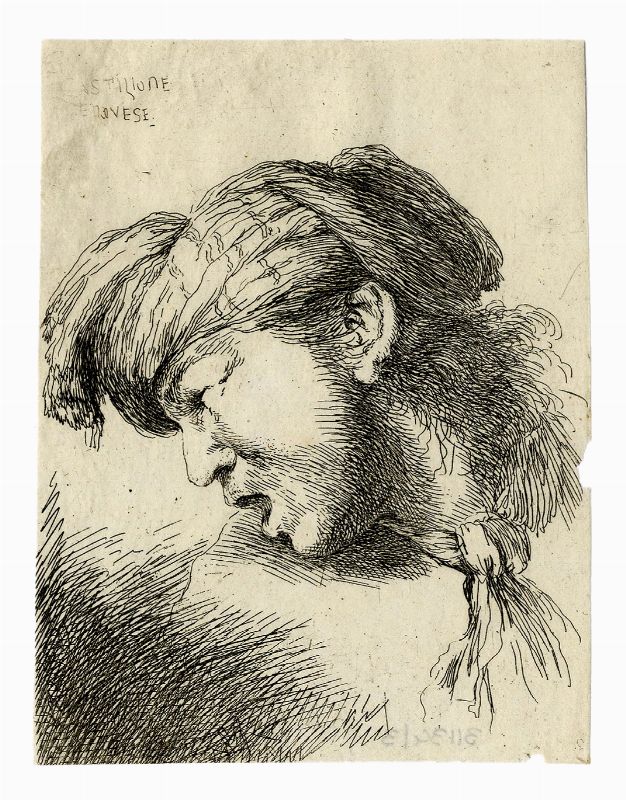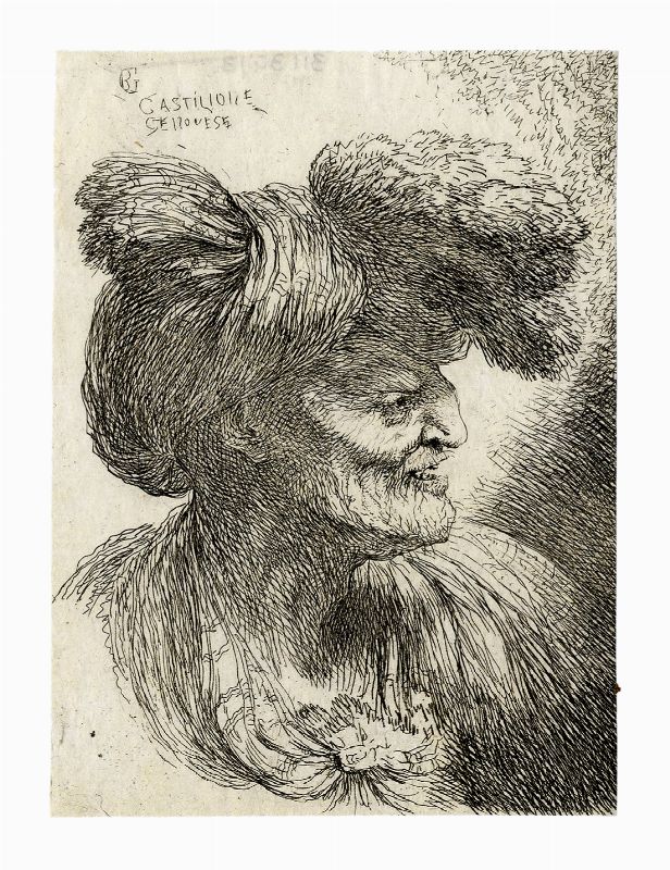 1) Testa di vecchio con turbante. Acquaforte. mm 108x78. Bellini (Castiglione), 25. 2) Giovane che grida volto a sinistra. Acquaforte. mm 105x80. Bellini (Castiglione), 32. 3) Giovane uomo con tromba. Acquaforte. mm103x80. Bellini (Castiglione), 35. Belle impressioni su carta vergellata molto sottile.
