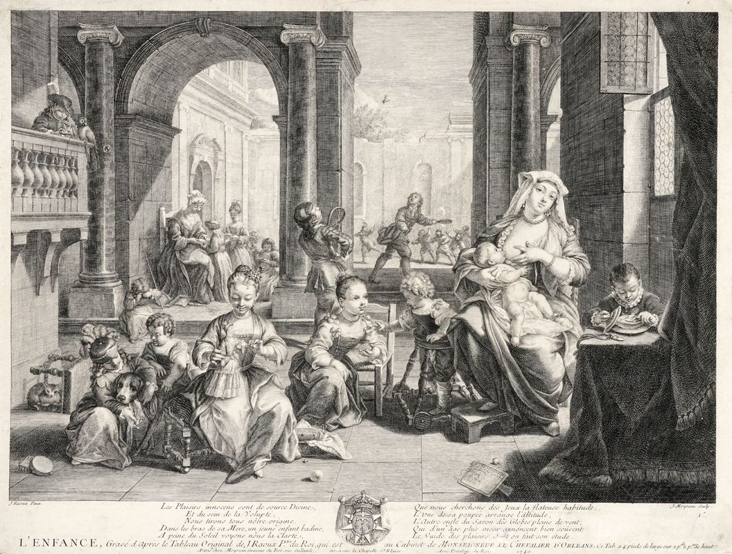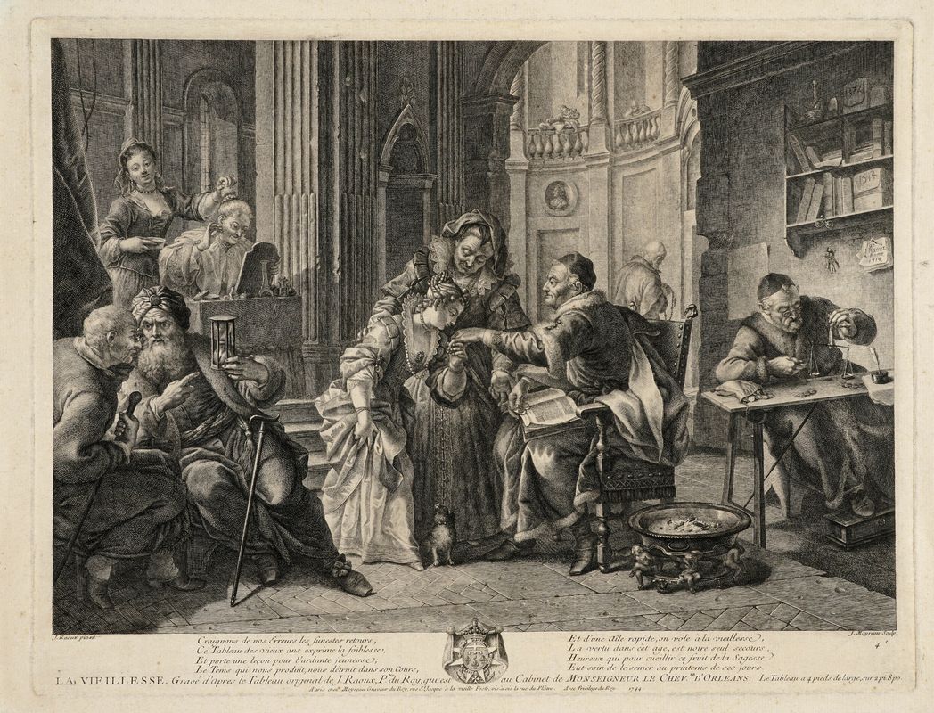 Acquaforte/Bulino/Mezzotinto. Dimensioni varie. Juste Chevillet (Francoforte, 1729–Parigi, 1802), La santé portée / La Santé rendue. Acquaforte e bulino. mm 460x325 / Pierre Jacques Duret (Parigi, 1729–1796), 1er clair de lune / 2me clair de lune. 1745-1760. Acquaforte. mm 290x348. / Nicolas Tardieu (Parigi, 1674-1749). La peinture / L'Eloquence. 1745 ca. Bulino. mm 311x362. Da una serie di 5 allegorie. / Jean-Baptiste Haussard (Parigi, 1679-1749). Le Printemps / L'Esté. Acquaforte e bulino. mm 312x388. / Achille Moreau (attivo in Francia nel XIX secolo). La Nuit / La Soir. Maniera nera. / Jean Moyreau (Orléans,, 1690-Parigi, 1762). L'Enfance / La Jeunesse / La Viellesse. Bulino. mm 417x533 .
