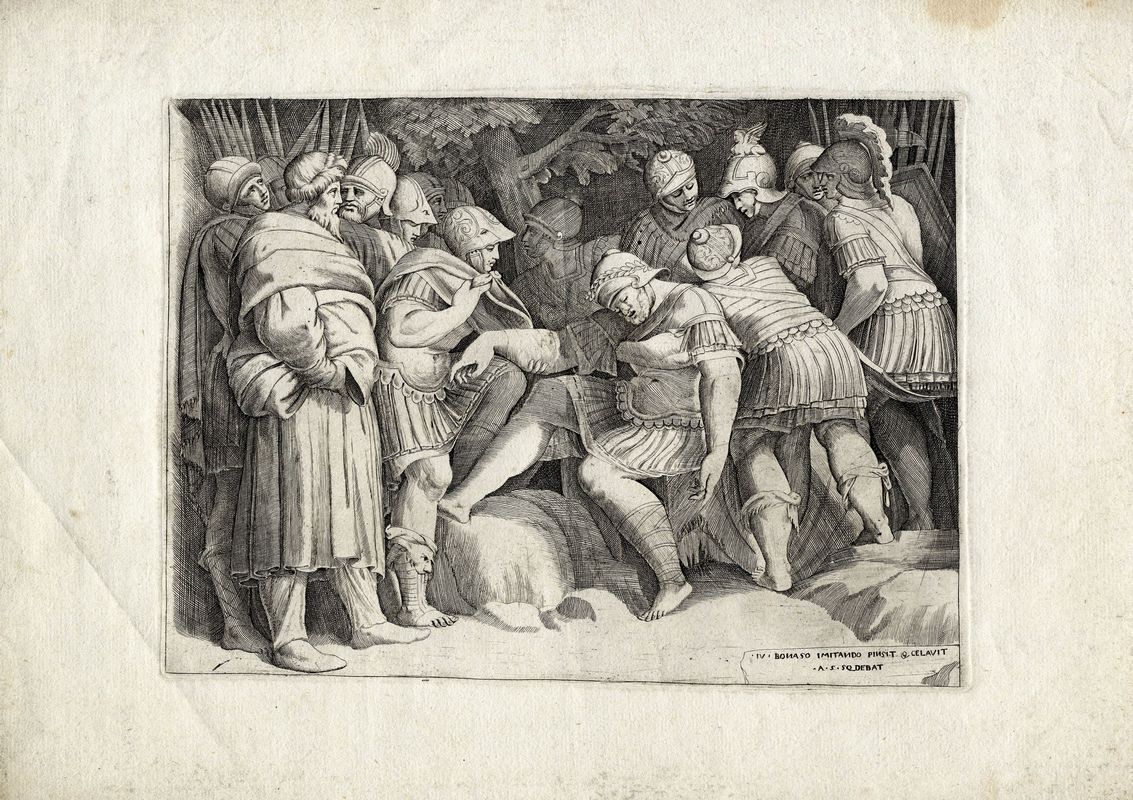 Bulino in coloritura. mm 205x290. Hollstein, 7. Da un soggetto di Karel van Mander. Terza tavola da Le forze che governano il mondo, serie in quattro incisioni databile al 1595-96. SI AGGIUNGE: Giulio Bonasone. Scipione ferito sorretto dai suoi soldati. Bulino. mm 202x268. Foglio: mm 290x435. Massari, 74. Tiratura tarda su carta vergellata pesante.