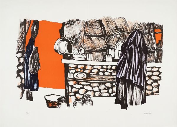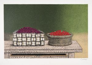 Litografia. mm 397x623. Foglio:520x700. Firma a matita in basso a destra e tiratura in basso a sinistra. Es. 10/99. Entro cartella editoriale originale con testo di Leonardo Sciascia. SI AGGIUNGONO: 2-3) Sirio Midollini, 2 incisioni. Litografie. mm 353x553 circa cad. Firme a matita in bassoa destra e tirature in basso a sinistra. Es. 10/60.