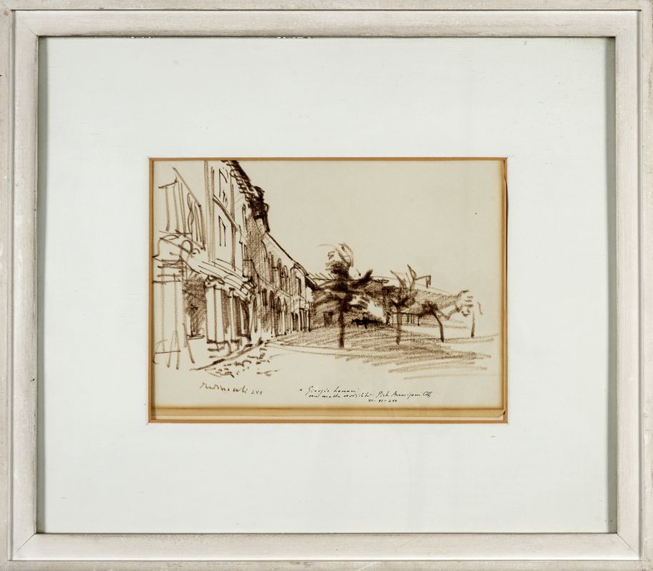 Pastello a cera bruno su foglio di album. mm 220x300. Dedica, firma e data a penna e inchiostro di china in basso a destra.