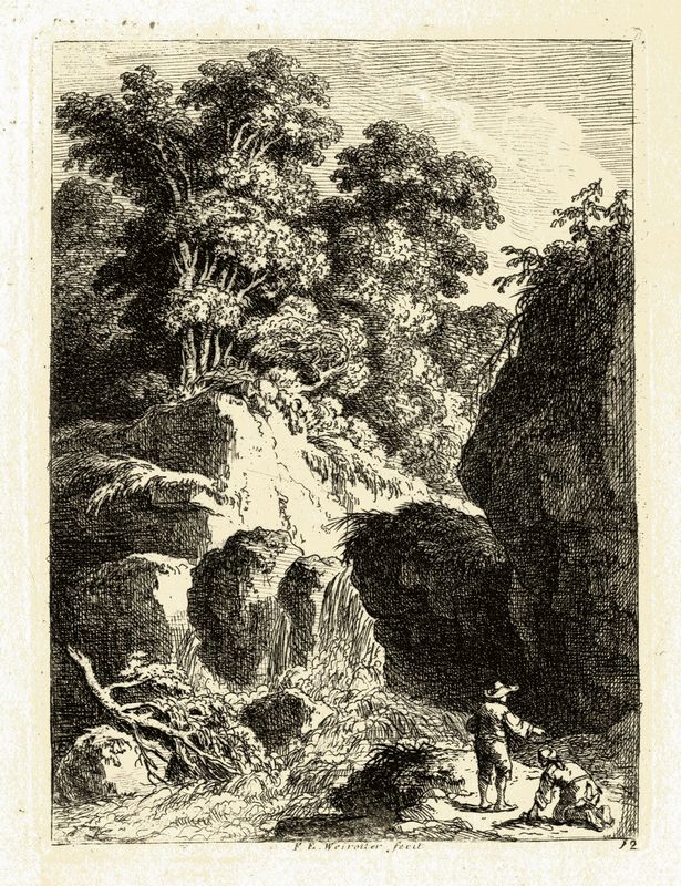 Acquaforte. mm 198x278. Foglio: mm 208x300. Hollstein, 2. Firmata al centro del margine in basso. Ottima prova nel III stato di 3 su carta vergata pesante. SI AGGIUNGE: Franz Edmund Weirotter (Innsbruck, 1730-Vienna, 1771). Paesaggio con cascata. mm137x101. Foglio: mm 168x119. Bellissima prova su carta vergellata sottile. Id:, Scena al chiaro di luna con tre figure davanti a capanne. 1760 ca. Acquaforte e mezzotinto. mm 146x205. Foglio: mm 175x242.