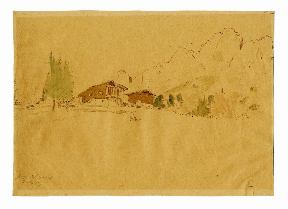 Acquerello, penna e inchiostro di china su carta velina applicata a carta greve. Monogrammato in basso a destra, titolato e datato in basso a sinistra, dedicato a penna a sfera blu al verso.