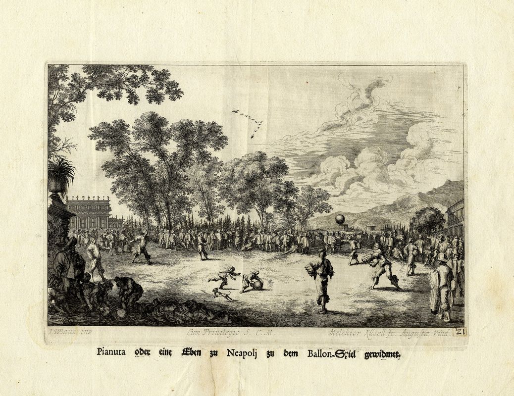 Bulino. mm 172x257. Foglio: mm 260x320. Tavola raffigurante il gioco del pallone a Napoli da Iconographia complectens in se Passionem, Miracula, Vitam Christi Universam, Nec Non, Prospectus Rarissimorum Portuum, ... Rerum, Quae Per Italiam Spectatu Sunt Dignae,1670, contenente belle vedute di Venezia, Firenze, Roma, Napoli e Genova.