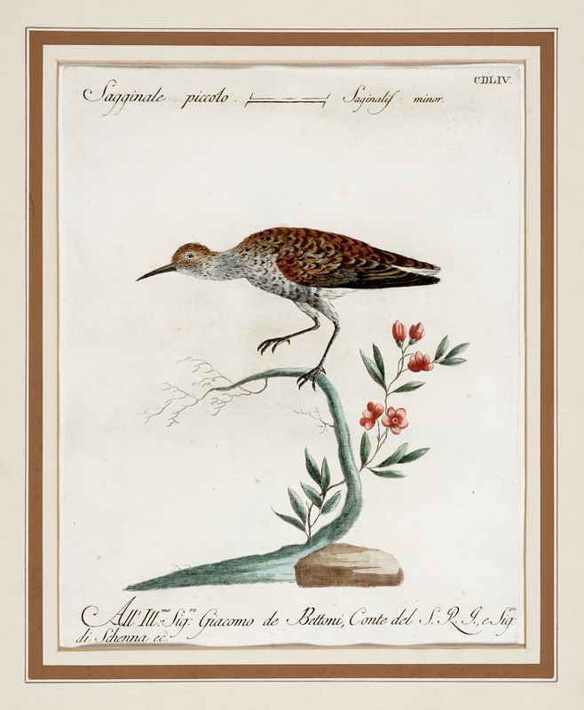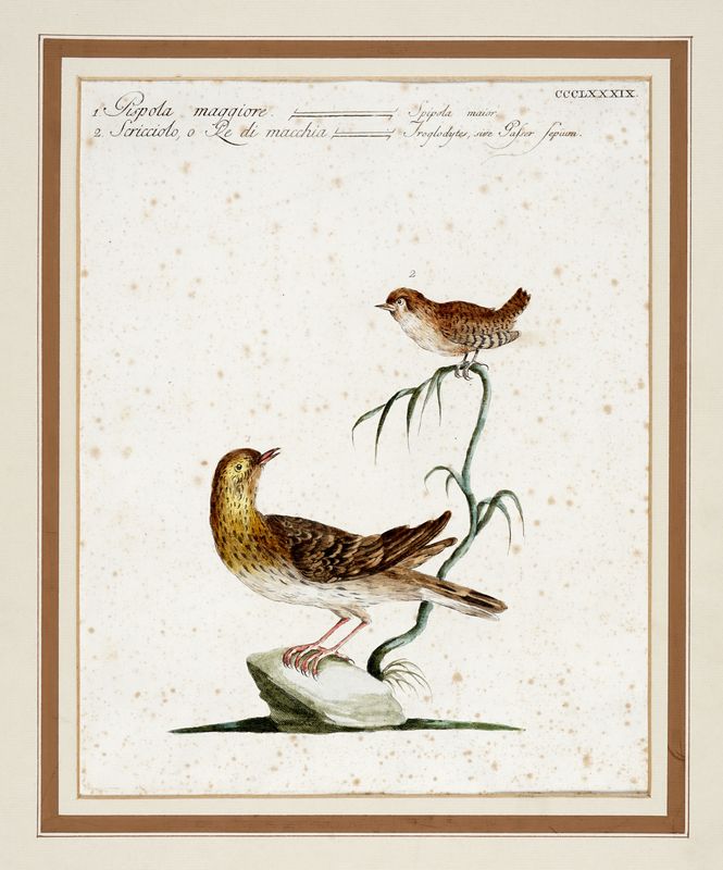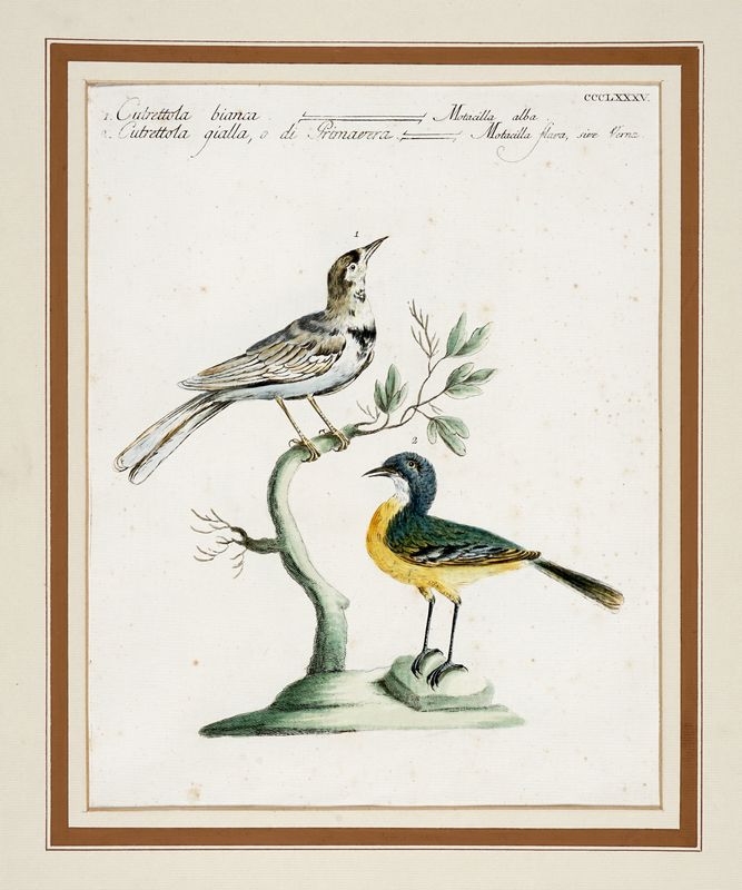 Lotto composto da quattro incisioni all'acquaforte colorate a mano. mm 345x273/5 (ciascuna). Fogli: mm 455x360 (ciascuno). Tavole nn. CDLIV (Sagginale piccolo), CCCLXXXV (Cutrettola bianca), CCCXCII (Beccafico canapino), CCCLXXXIX (Pispola maggiore), tratte dall'opera Ornithologia methodice digesta atque iconibus aeneis ad vivum illuminata ornata (latine et italice a Xav. Manetti Laurentio Lorenzi et Violante Vanni). Florentiae, 1767-76. In alto didascalia descrittiva delle immagini; in basso, su alcune tavole, dedicatoria.