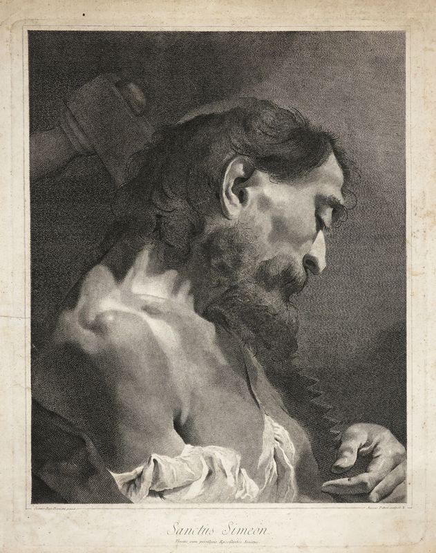 Bulino. mm 400x340.Foglio: mm 467x383. Le Blanc, 29-48. Da Giovan Battista Piazzetta. Tavola dalla serie La Sacra Famiglia e gli Apostoli. Bellissima prova su carta vergellata veneta IMPERIALE con filigrana "grande stemma con tre mezzelune".
