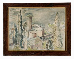 1950 circa. Acquerello su tela. cm 35,5x45,6. Iscrizioni a penna e inchiostro di china e datazione al verso [..]